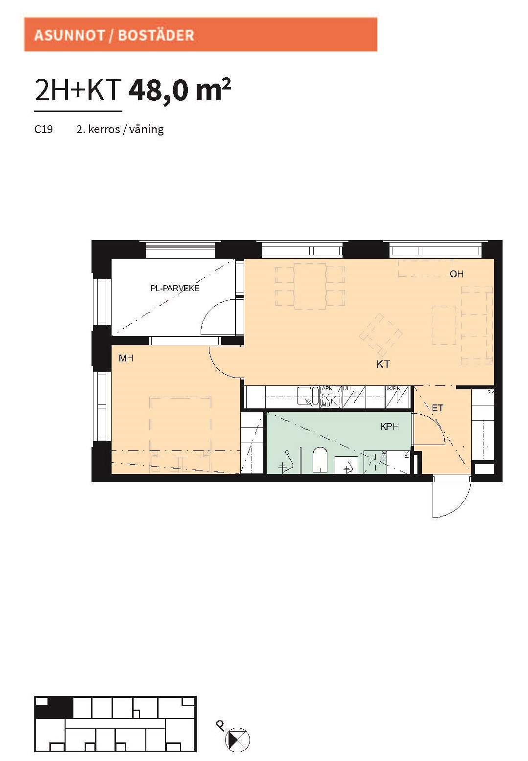 Tämä kaksio sijaitsee hissitalon 2. kerroksessa. Asunnossa on tilava olohuone yhdessä hyvin varustellun keittiötilan, makuuhuone, tilava kylpyhuone ja puolilämmin parveke, jota voi käyttää lisähuoneena. Vesikiertoinen lattialämmitys, huoneistokohtainen ilmanvaihto ja kaukolämpö. Taloyhtiö rakennettu 2023.
