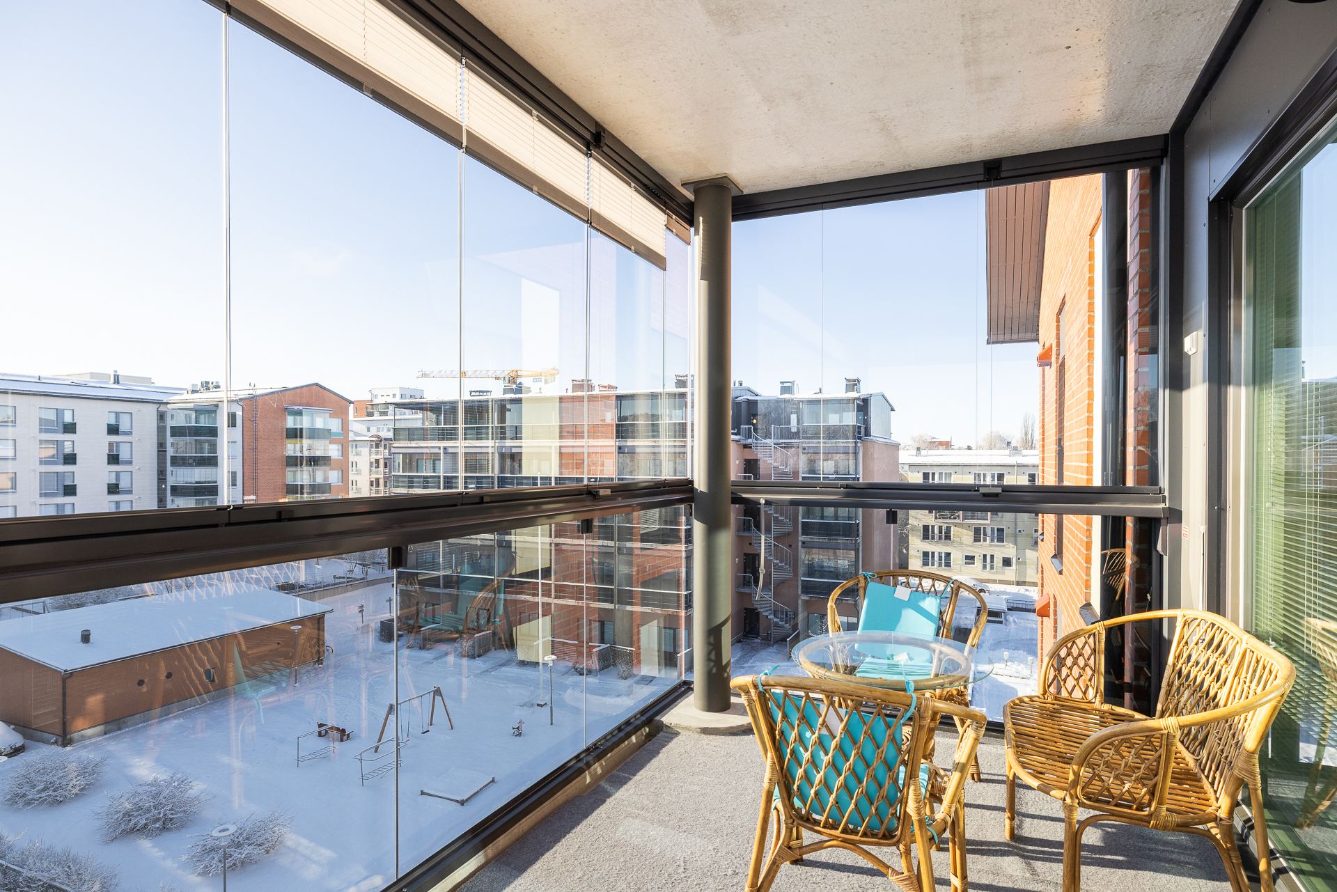 Ylimmän kerroksen 60,5 neliömetrin kolmio tarjoaa avarat näkymät etelän ja idän suuntiin. Käytännöllinen pohjaratkaisu sisältää kaksi makuuhuonetta, joista toisen yhteydessä on vaatehuone. Olohuoneesta on suora yhteys lasitetulle eteläparvekkeelle, jossa voi oleskella ja nauttia säästä riippumatta.