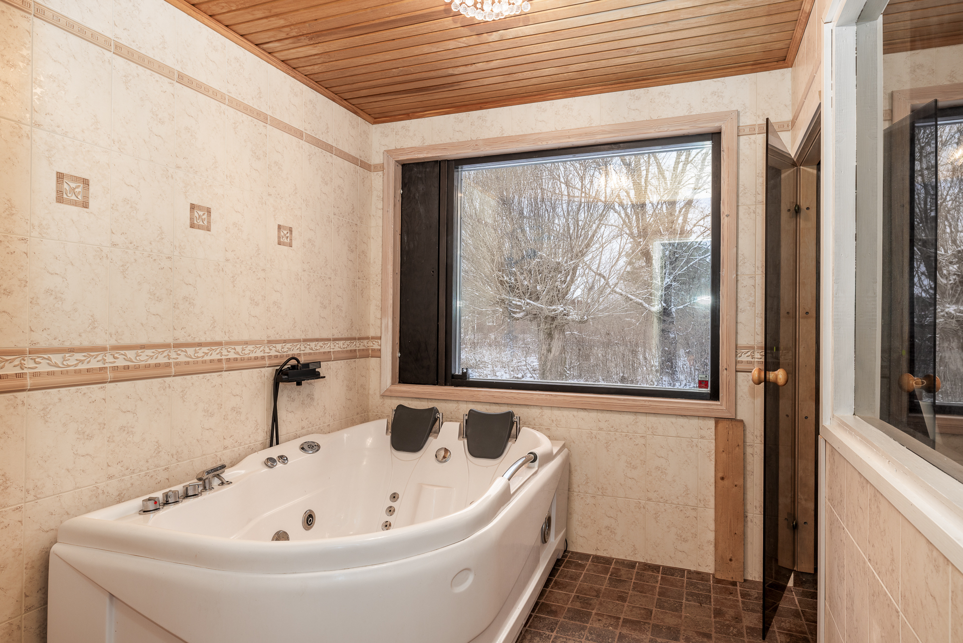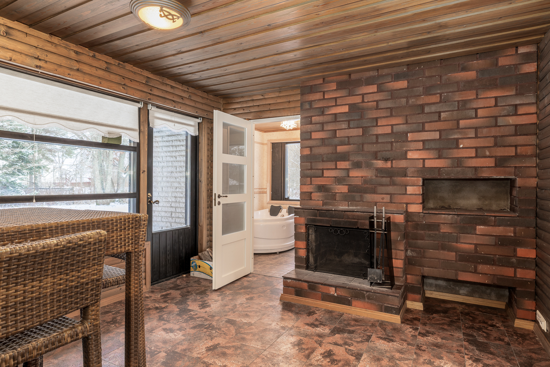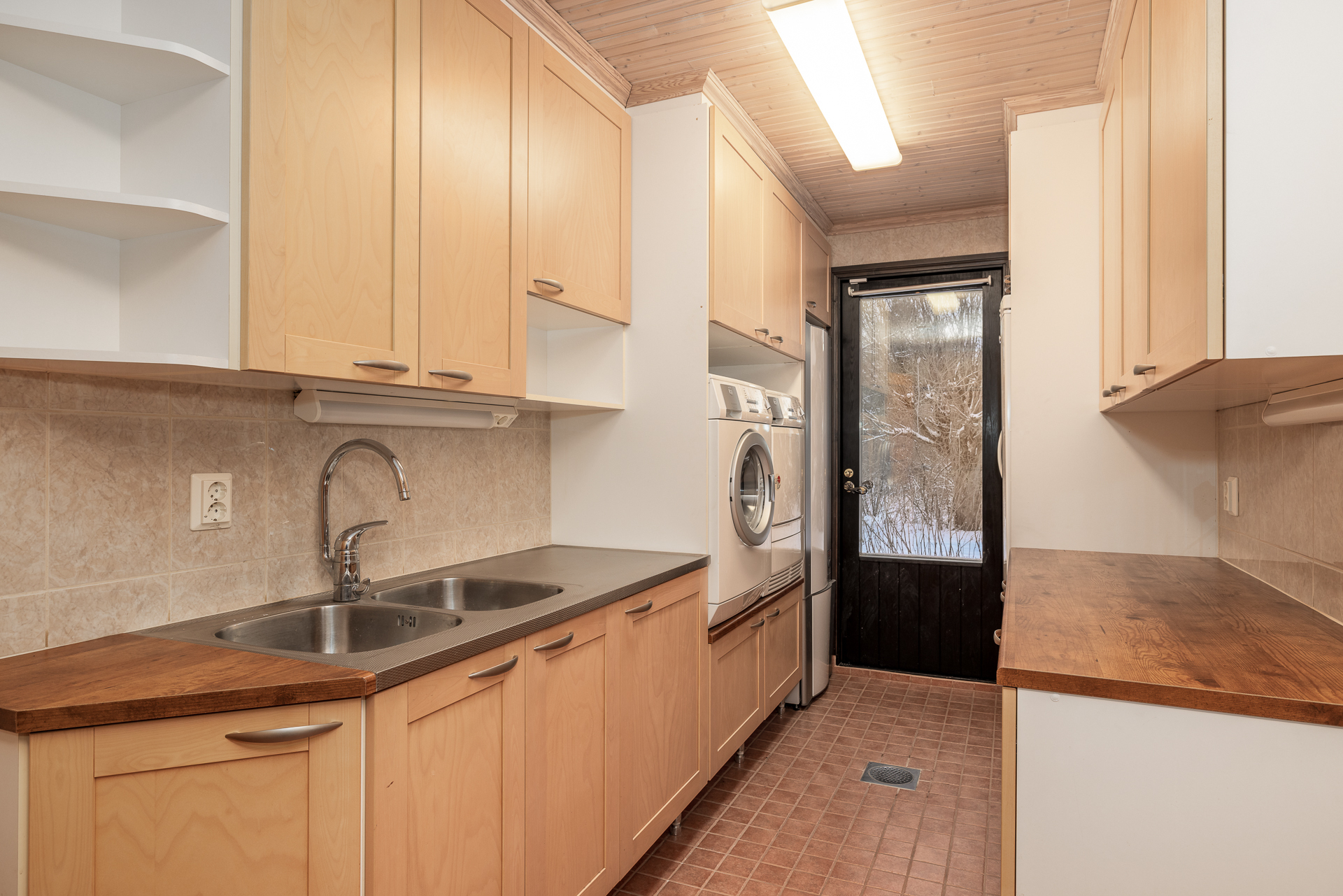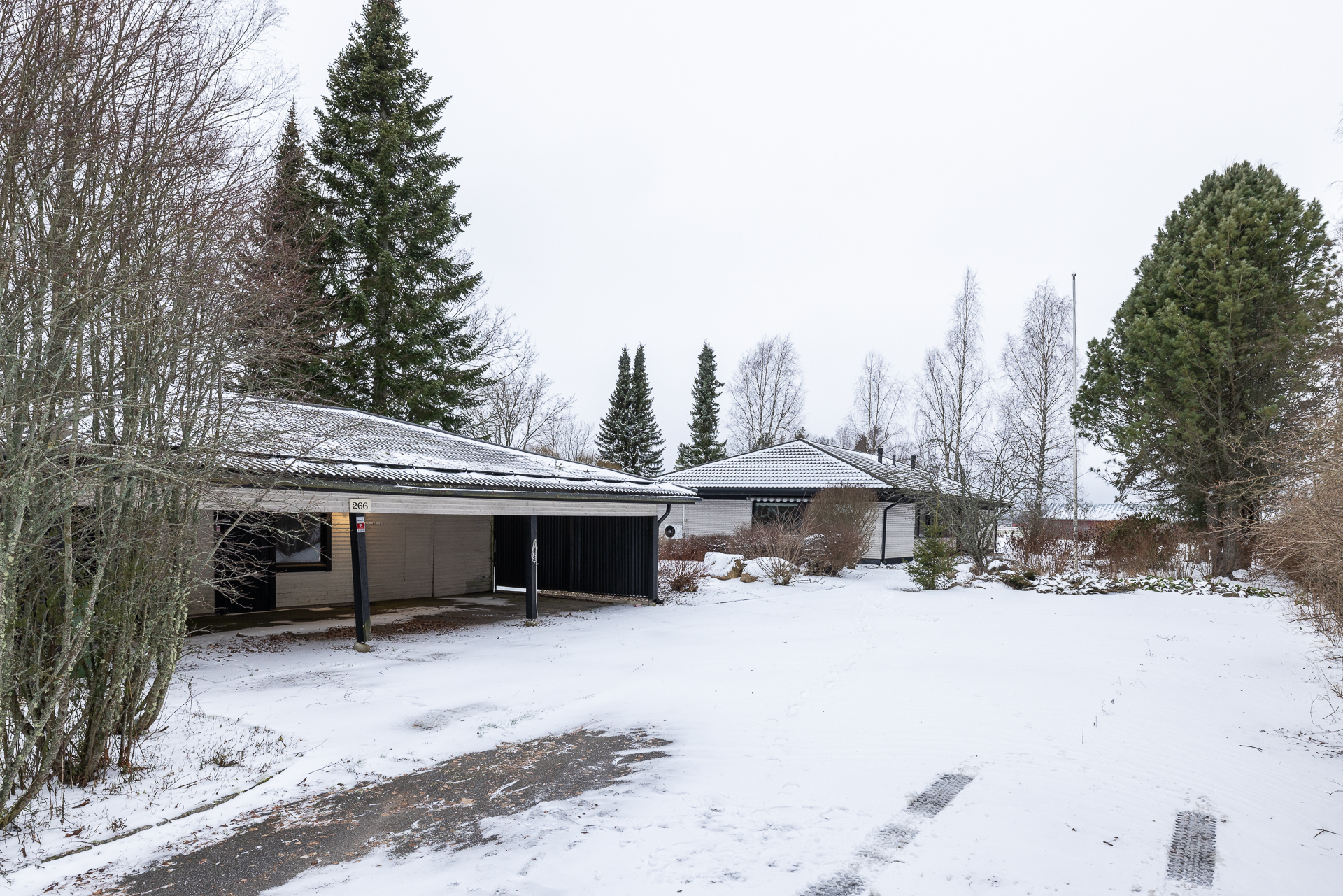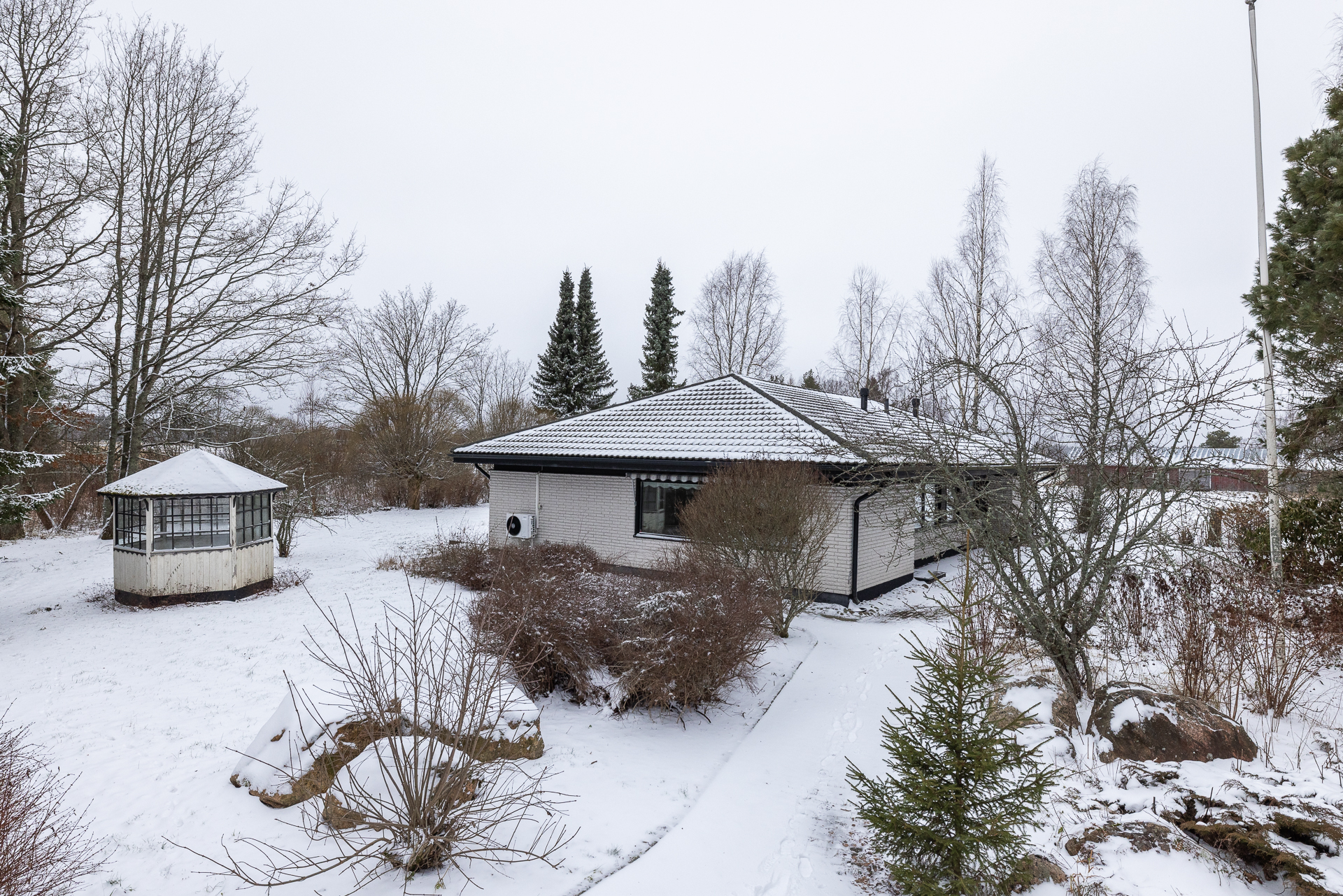 Asfaltoidulla pihalla sijaitsee myös erillinen 45 m²:n autotalli- ja varastorakennus, joka tarjoaa runsaasti säilytystilaa.