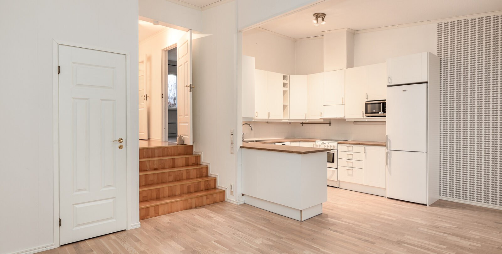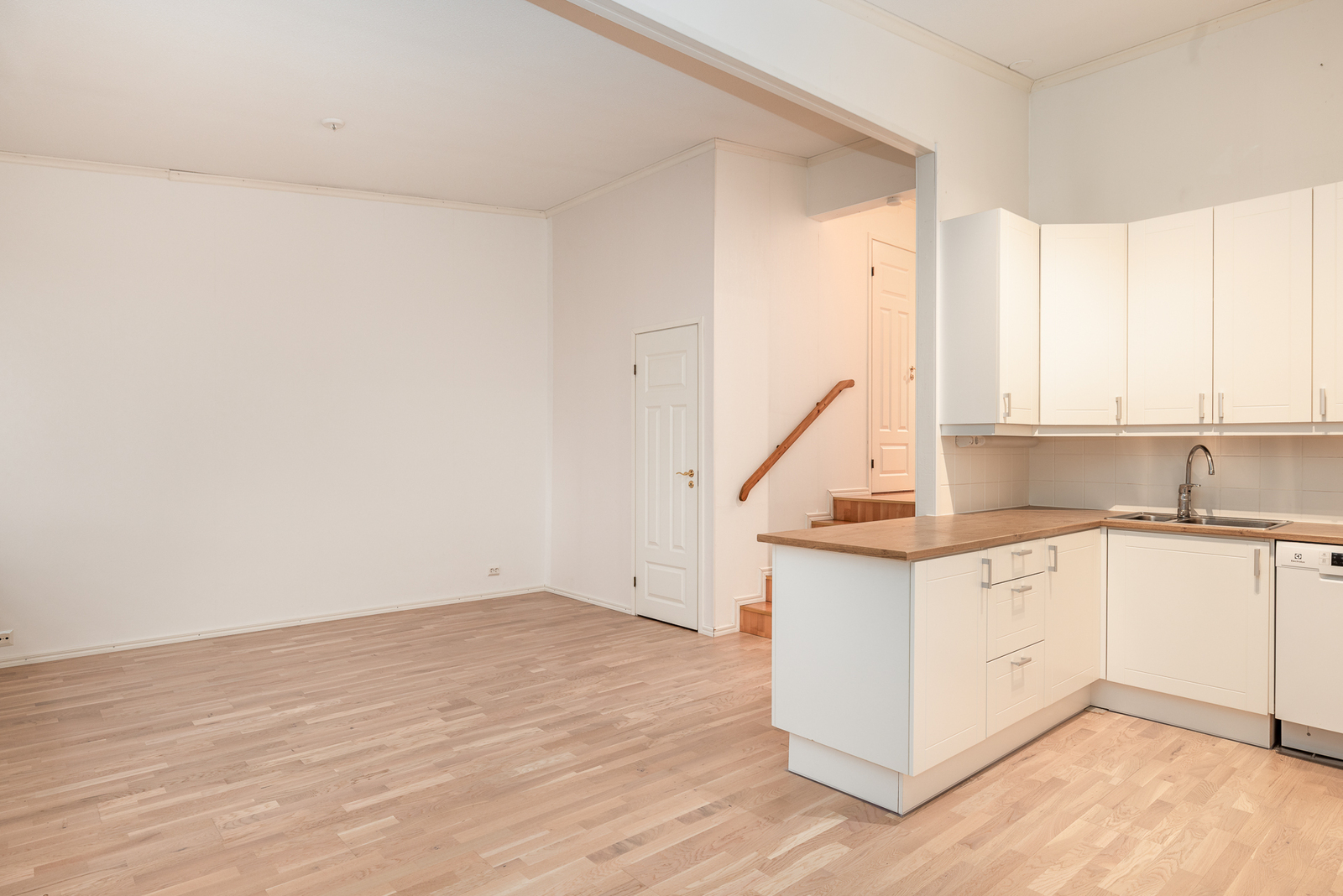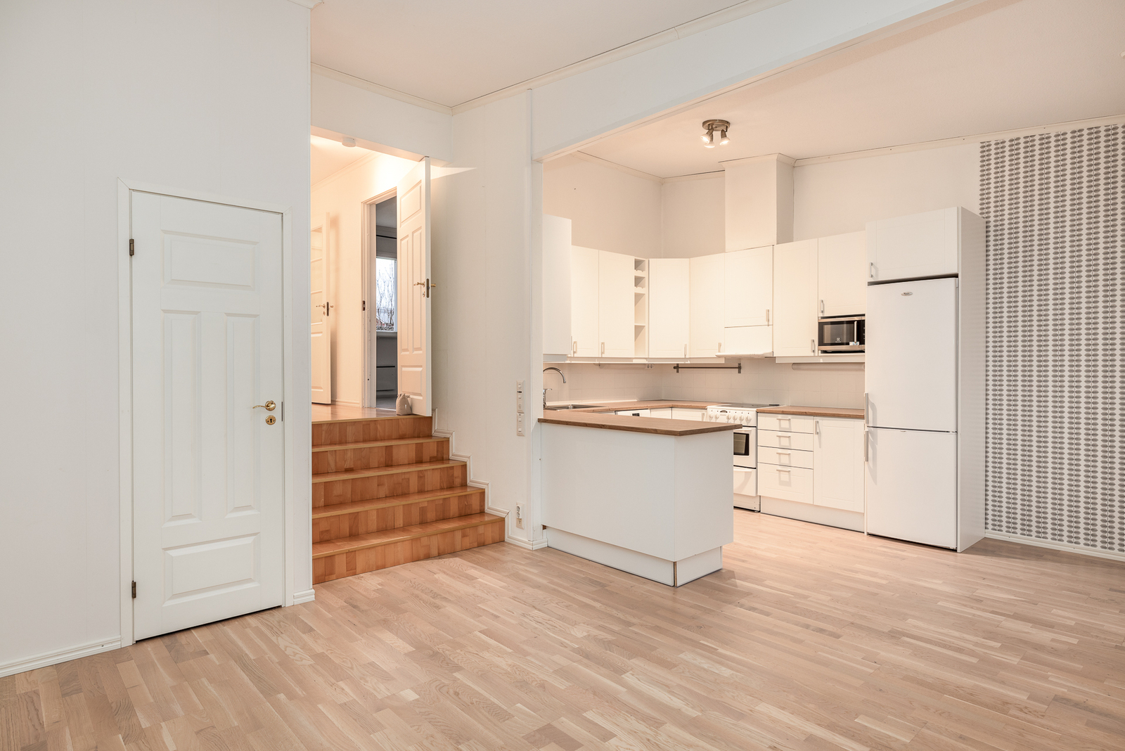 Muutama porrasaskel alempana saavut kodin avoimeen ja valoisaan oleskelutilaan. Keittiö, joka on uudistettu vuonna 2016, liittyy suoraan olohuoneeseen ja yhdessä ne muodostavat sosiaalisen ja kutsuvan kokonaisuuden. Kerrosten välinen korkeusero antaa tilalle vaikuttavan huonekorkeuden ja runsaasti luonnonvaloa.