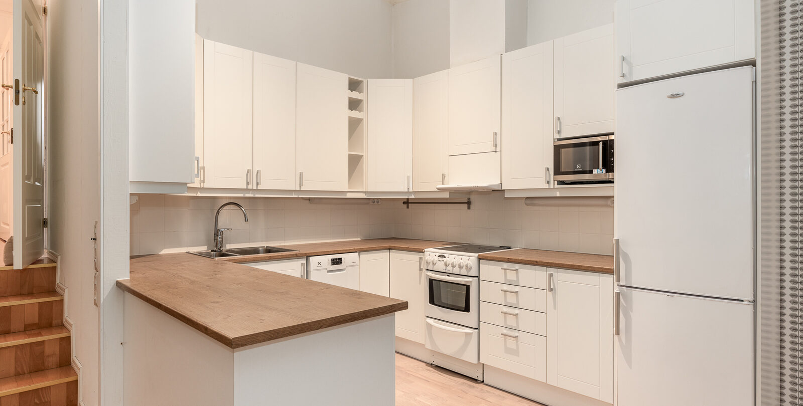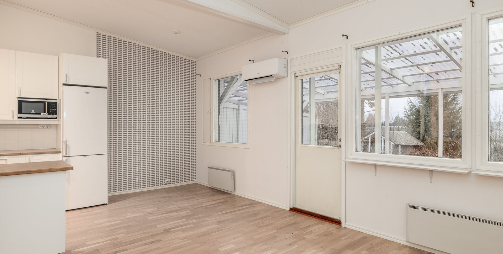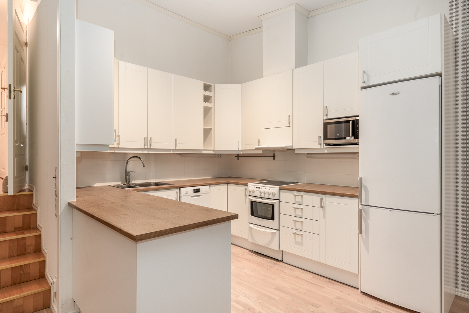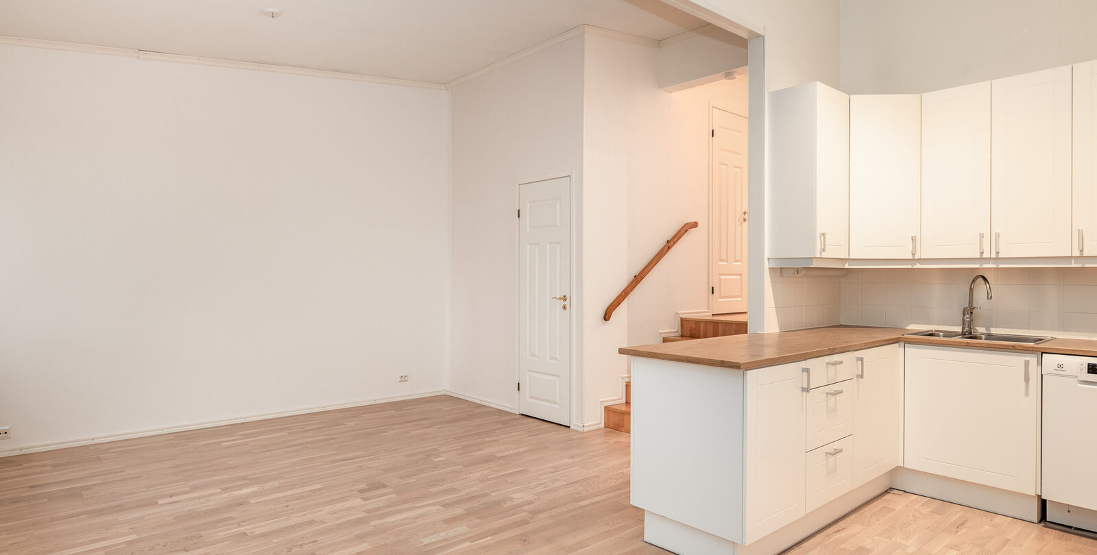 Muutama porrasaskel alempana saavut kodin avoimeen ja valoisaan oleskelutilaan. Keittiö, joka on uudistettu vuonna 2016, liittyy suoraan olohuoneeseen ja yhdessä ne muodostavat sosiaalisen ja kutsuvan kokonaisuuden. Kerrosten välinen korkeusero antaa tilalle vaikuttavan huonekorkeuden ja runsaasti luonnonvaloa.