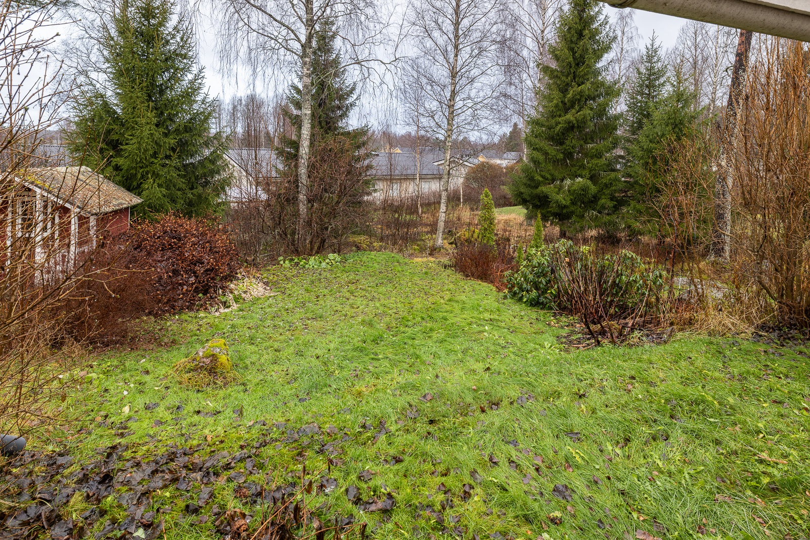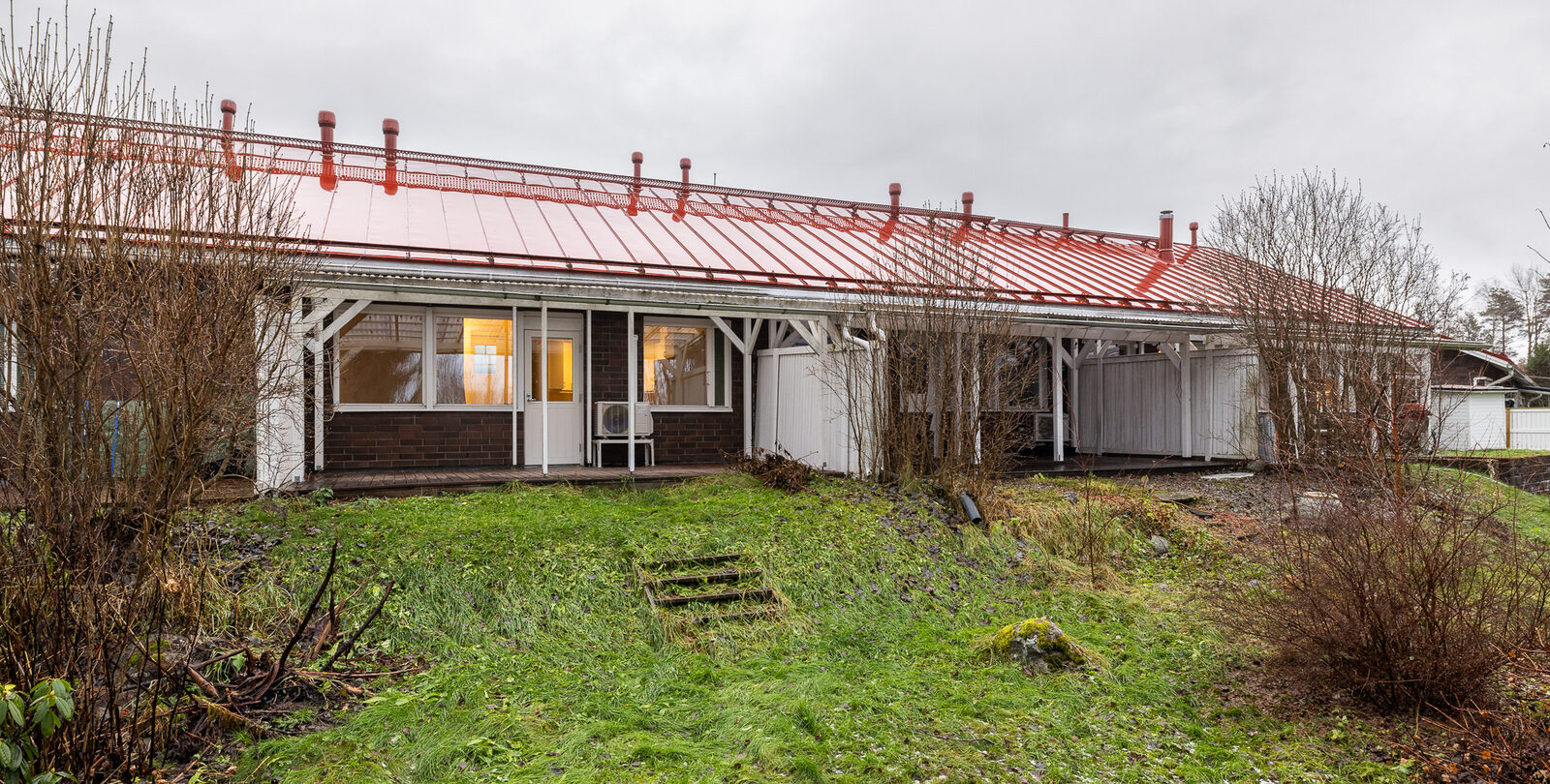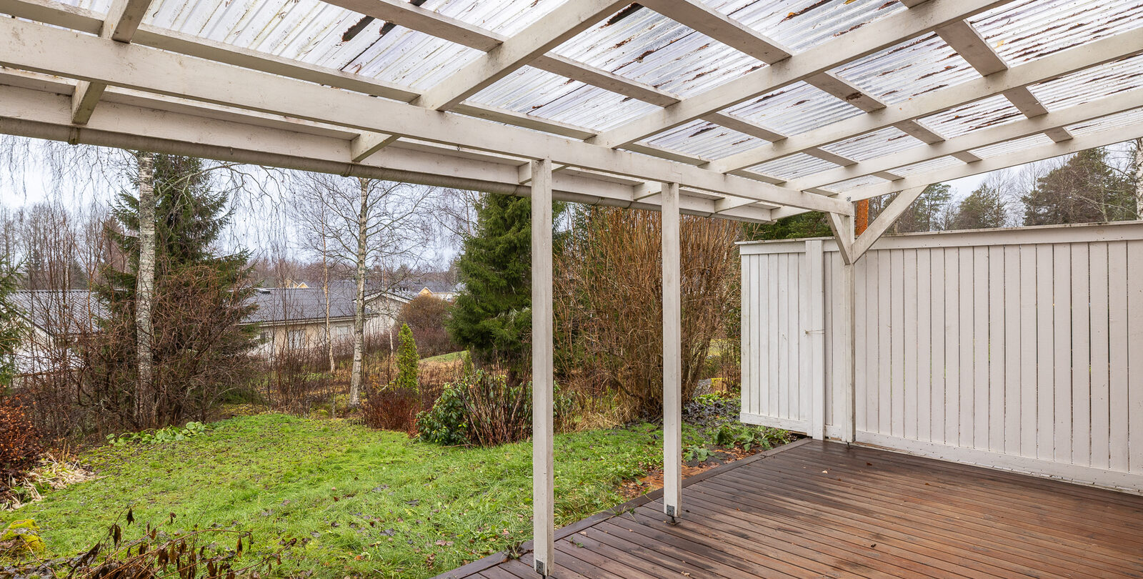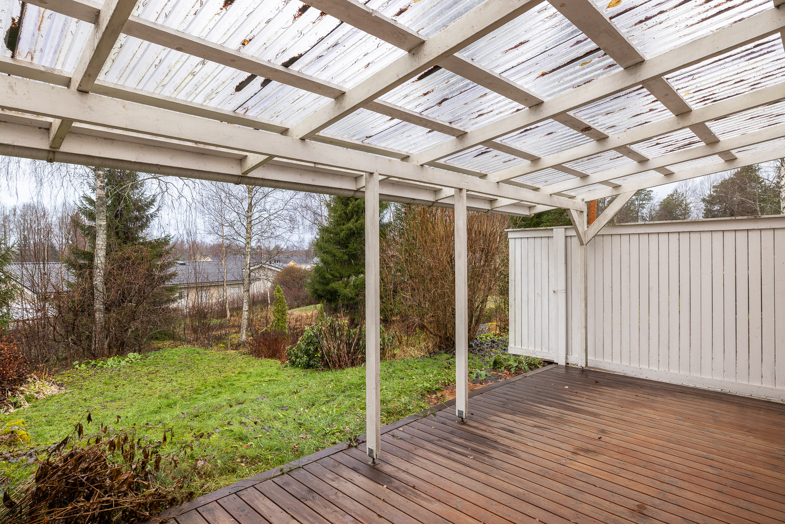 Olohuoneesta on käynti omalle suojaisalle takapihalle, jossa on katettu terassi, ihanteellinen paikka rentoutumiseen ja yhdessäoloon lämpiminä vuodenaikoina.