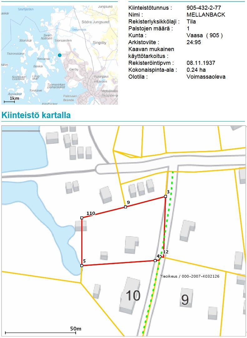 Lisätietoja rakennusoikeudestaTällä hetkellä yleiskaava 2030 mukaan, rakennusoikeus 10% tilan pinta-alasta (asuinrakennus ja talousrakennus yhteensä). Lisätietoja antaa Vaasan kaupunki.
