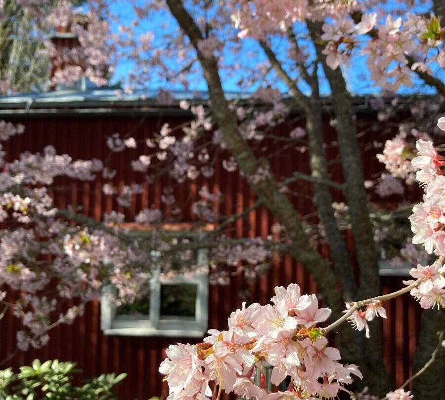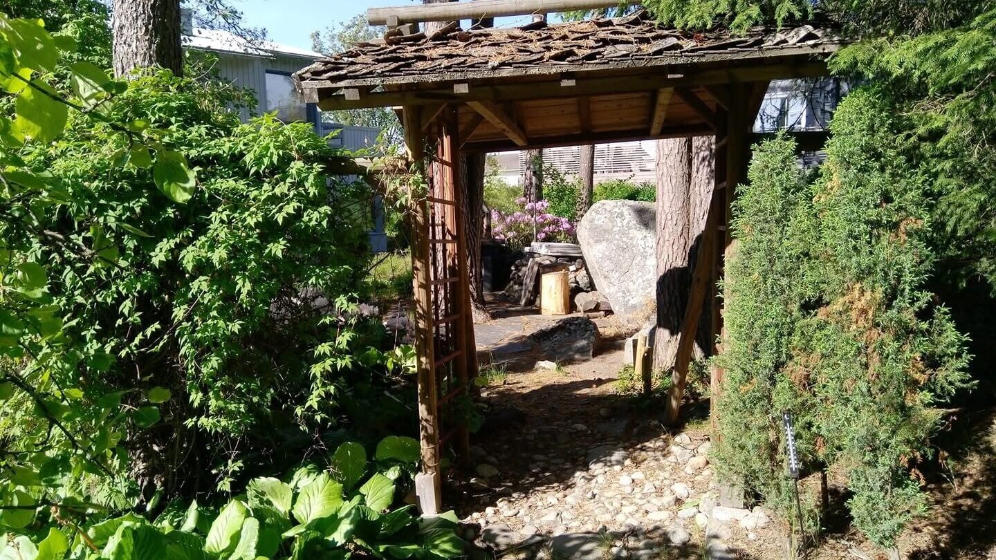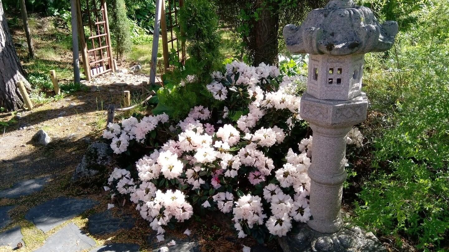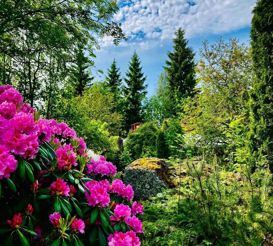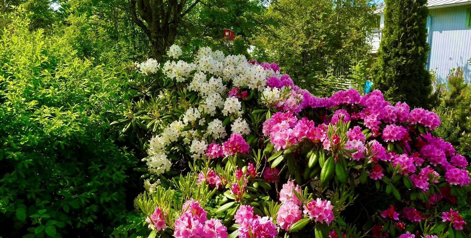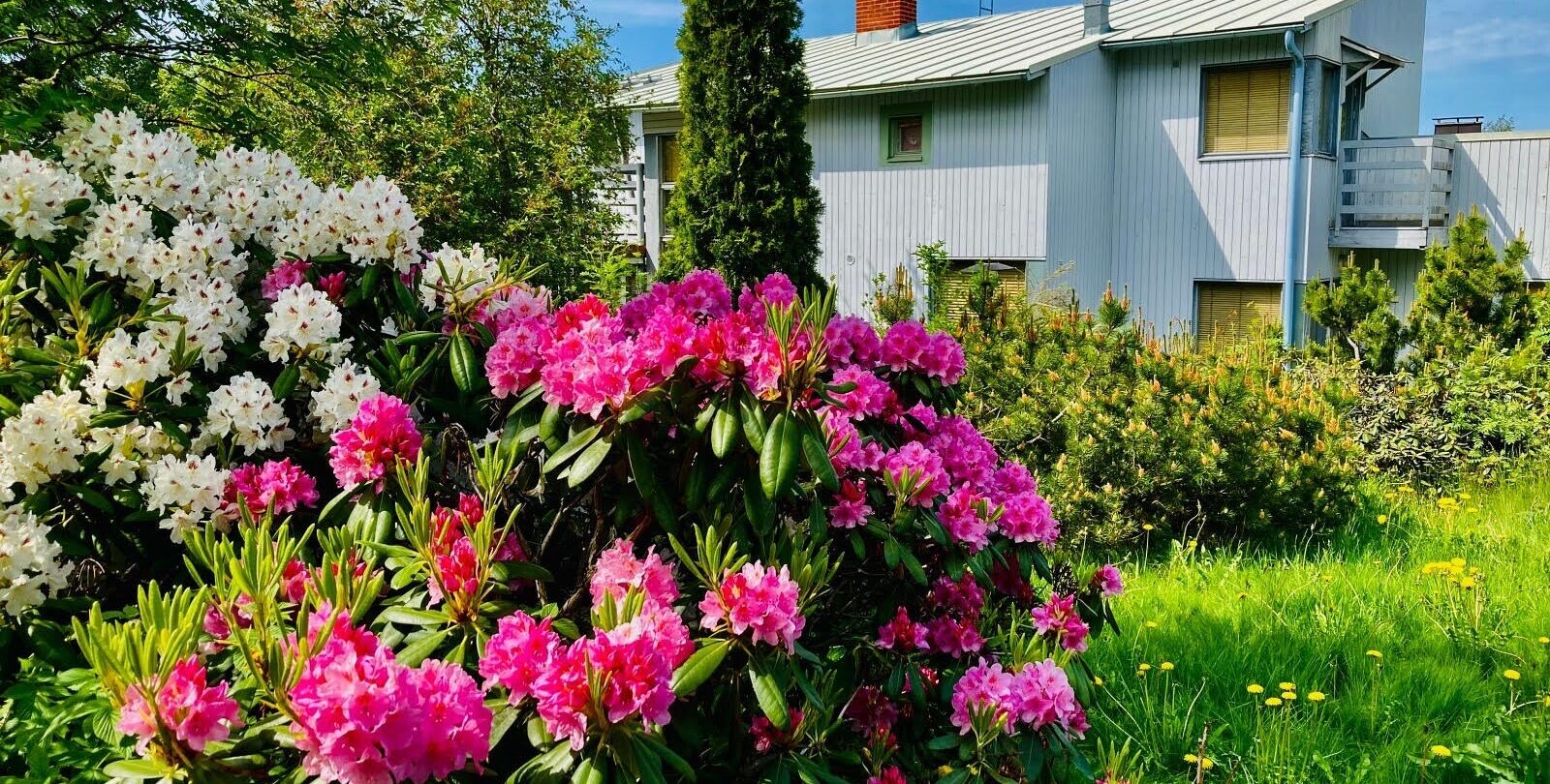 Kaunis puutarhatontti, jossa on paljon kauniita kukkia ja istutuksia.