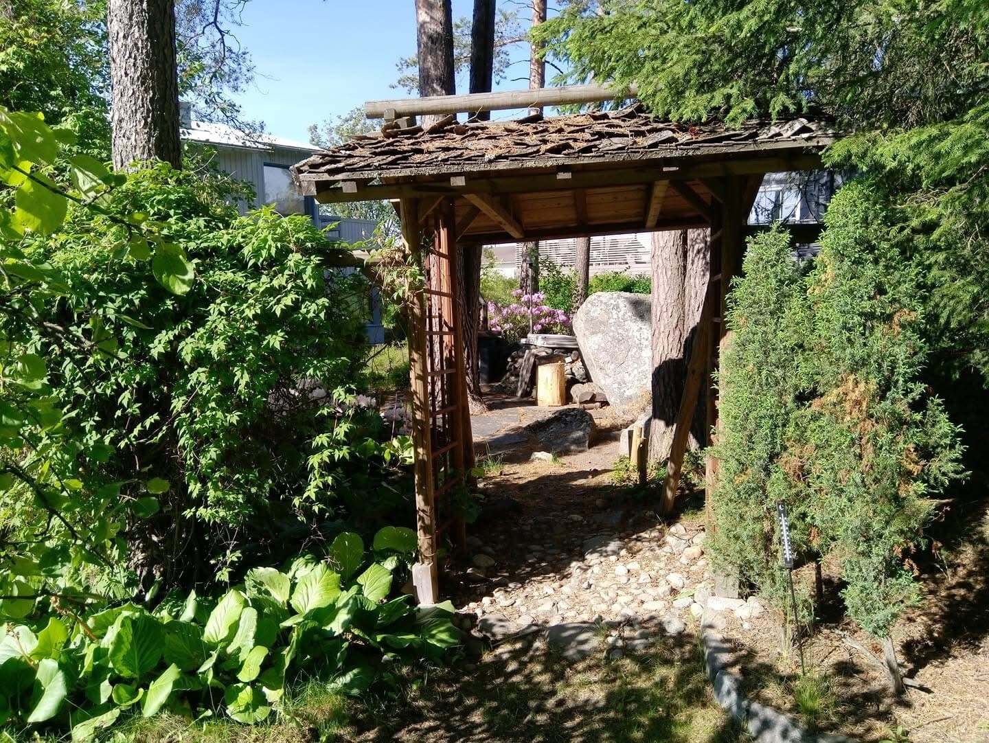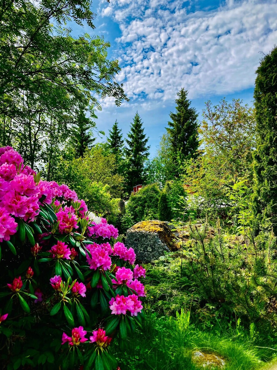 Kaunis puutarhatontti, jossa on paljon kauniita kukkia ja istutuksia.
