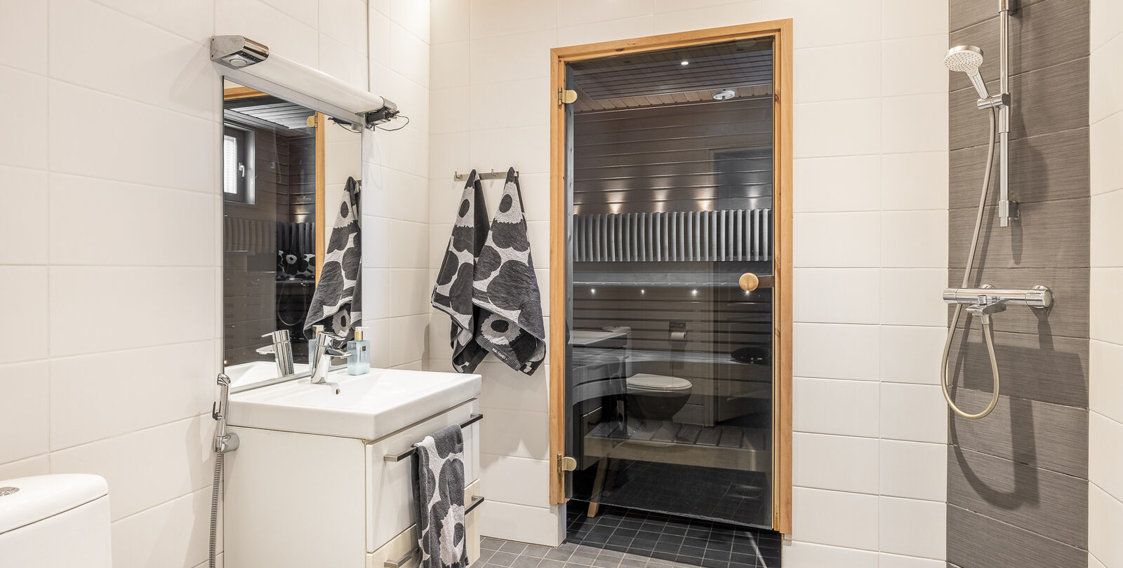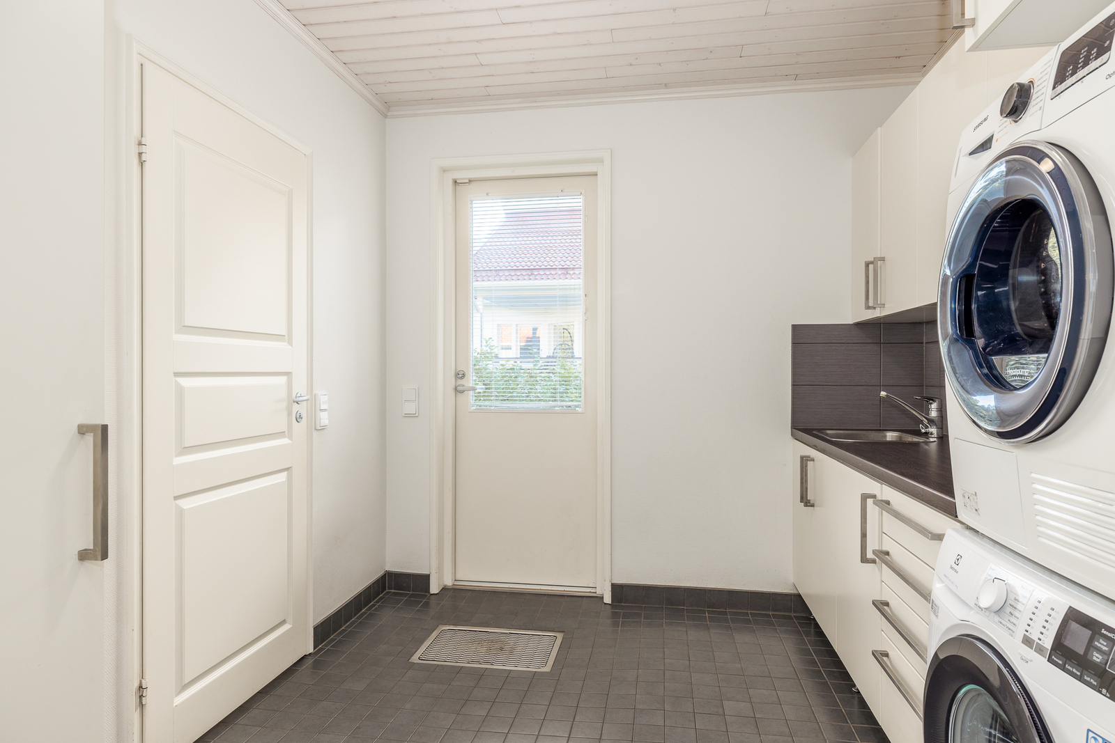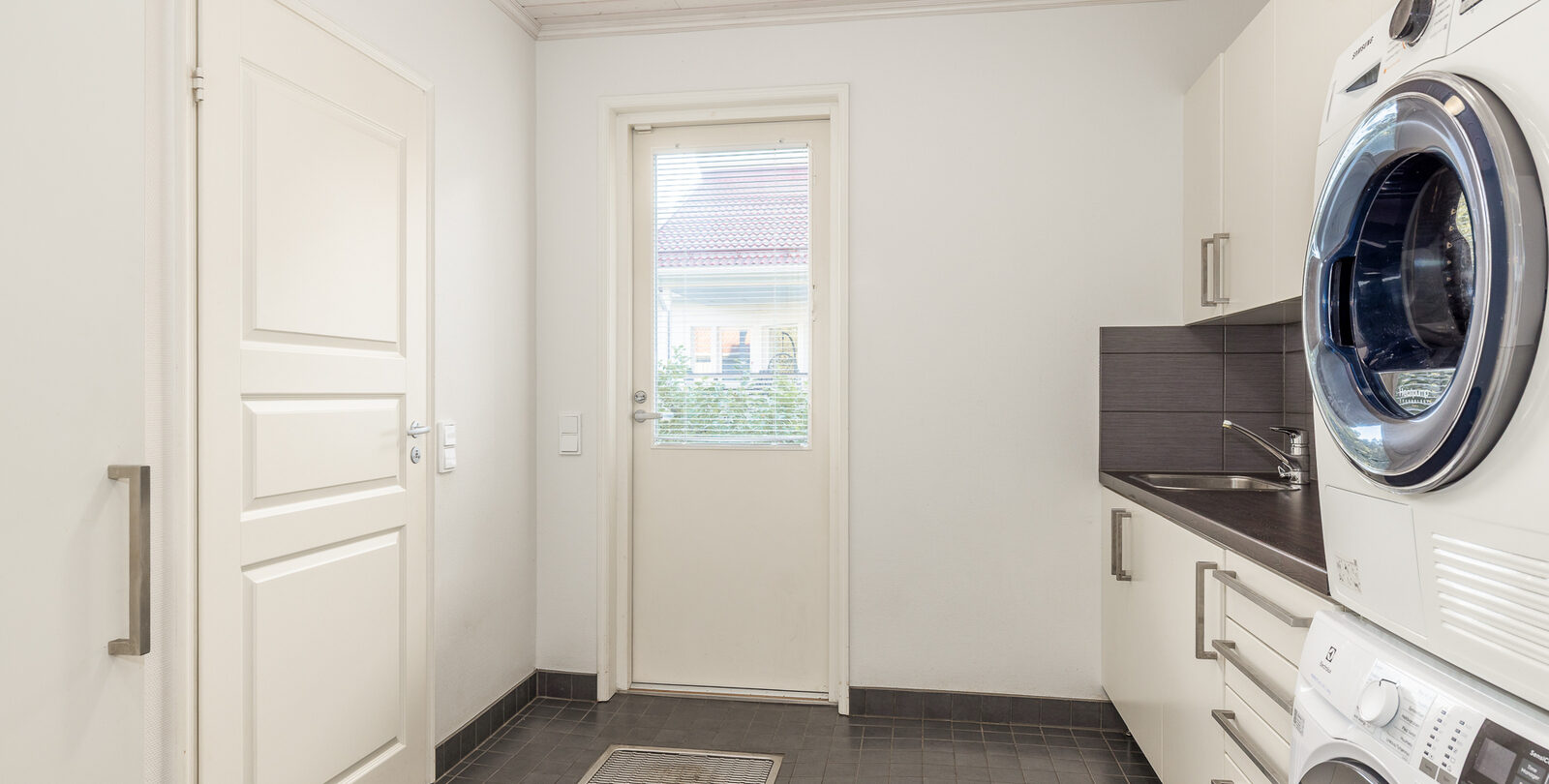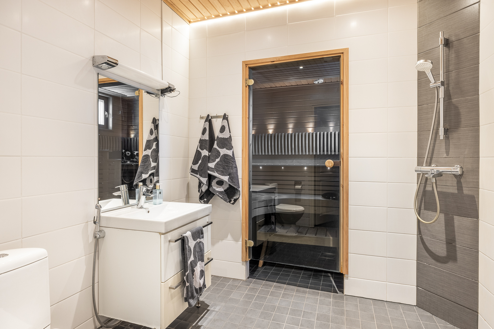 Kodinhoitohuone on suuri ja käytännöllinen, ja sieltä on suora käynti pihalle. Kylpyhuoneessa on kaksi suihkua ja WC, ja saunassa on tunnelmallinen vuolukivikiuas. Lisäksi sisäänkäynnin yhteydessä on erillinen WC lisäämässä arjen sujuvuutta.