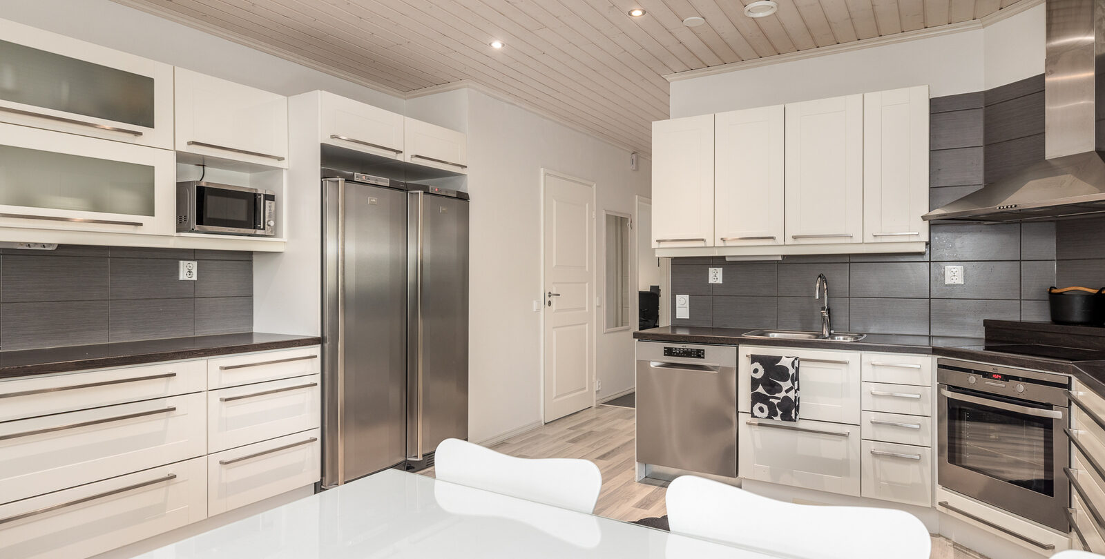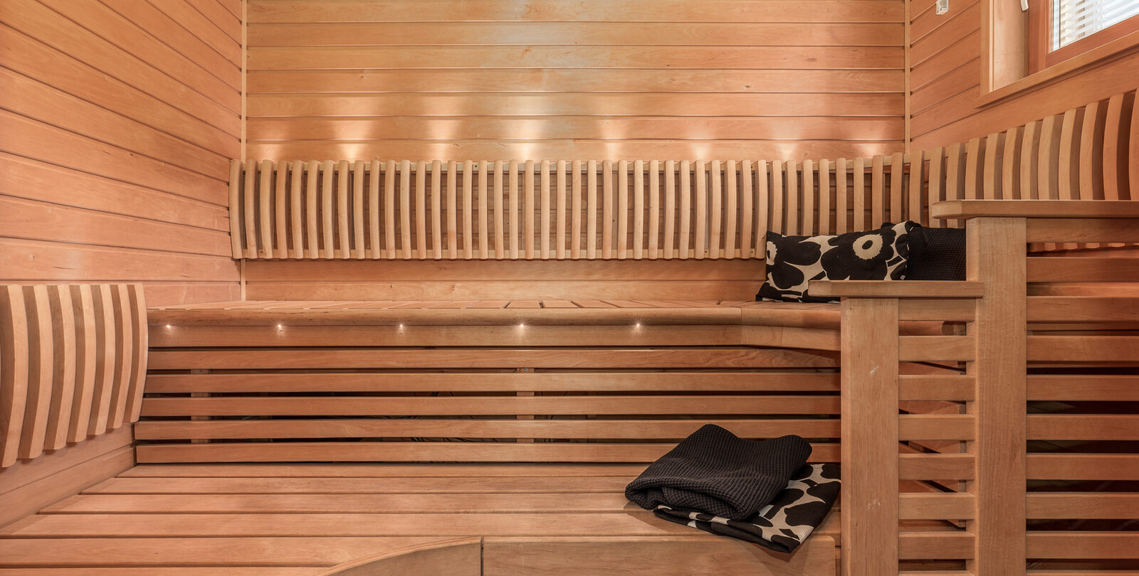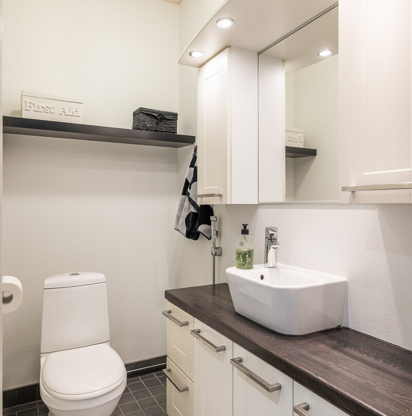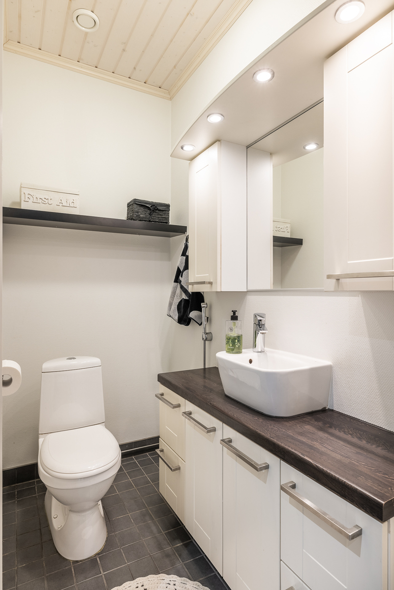 Kodinhoitohuone on suuri ja käytännöllinen, ja sieltä on suora käynti pihalle. Kylpyhuoneessa on kaksi suihkua ja WC, ja saunassa on tunnelmallinen vuolukivikiuas. Lisäksi sisäänkäynnin yhteydessä on erillinen WC lisäämässä arjen sujuvuutta.