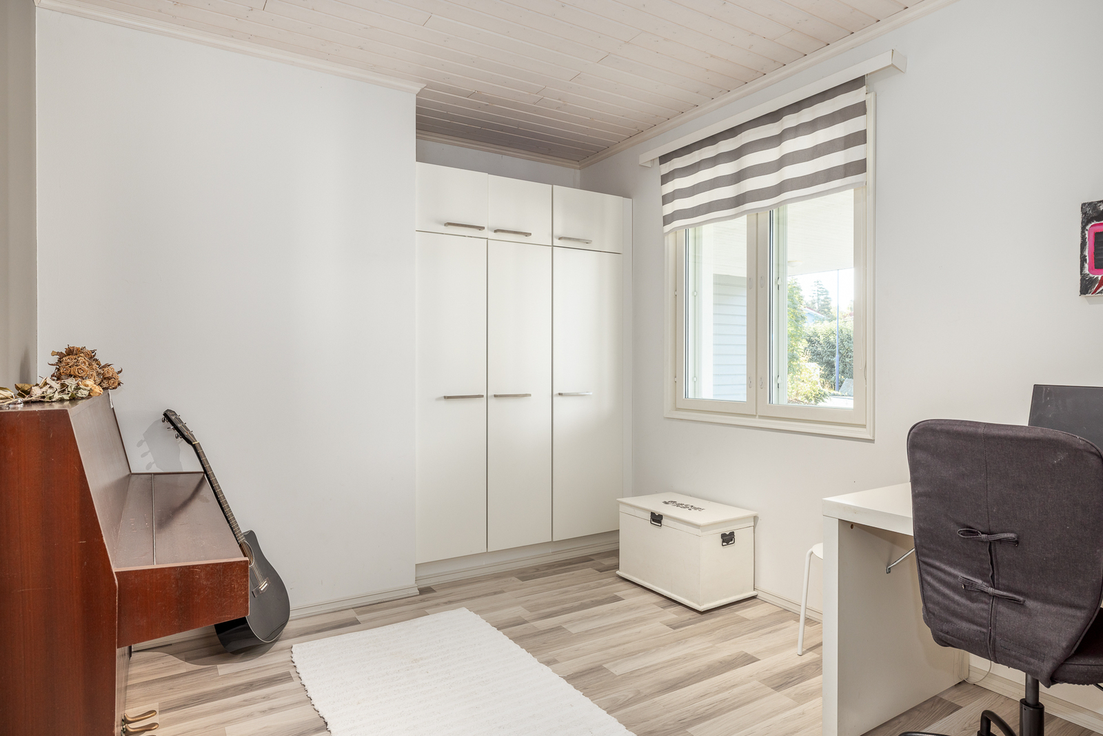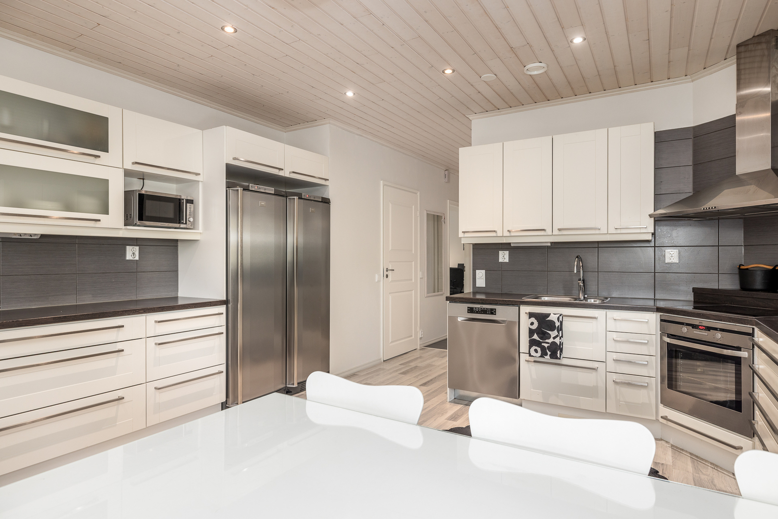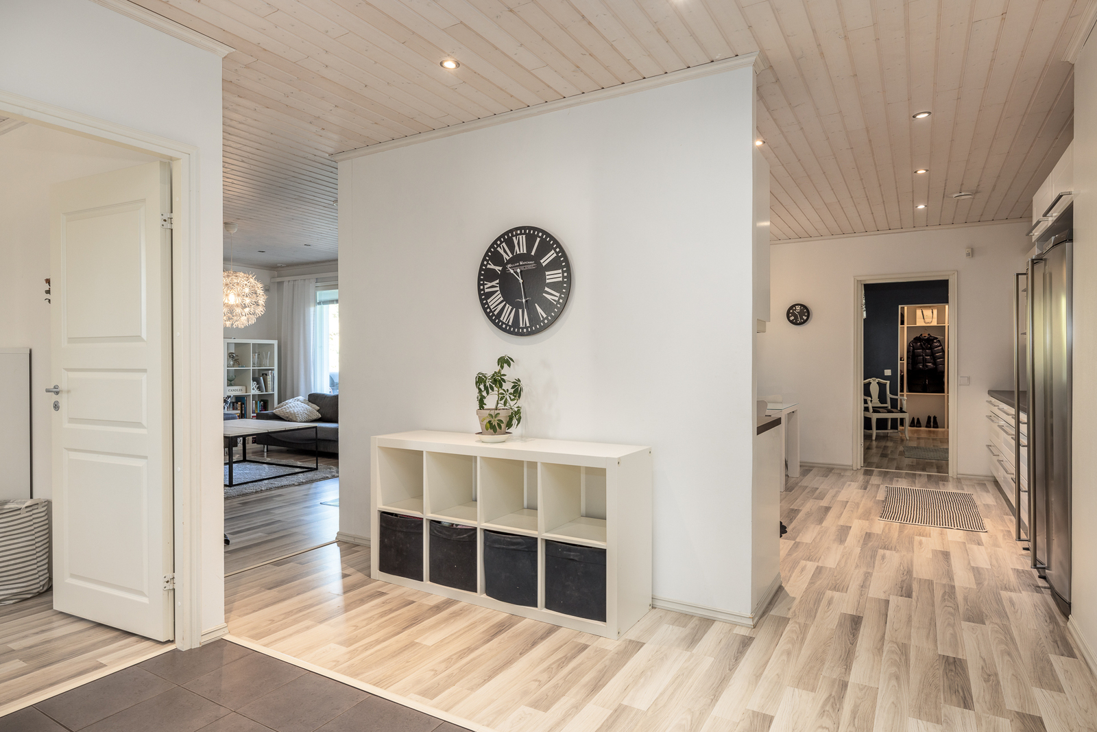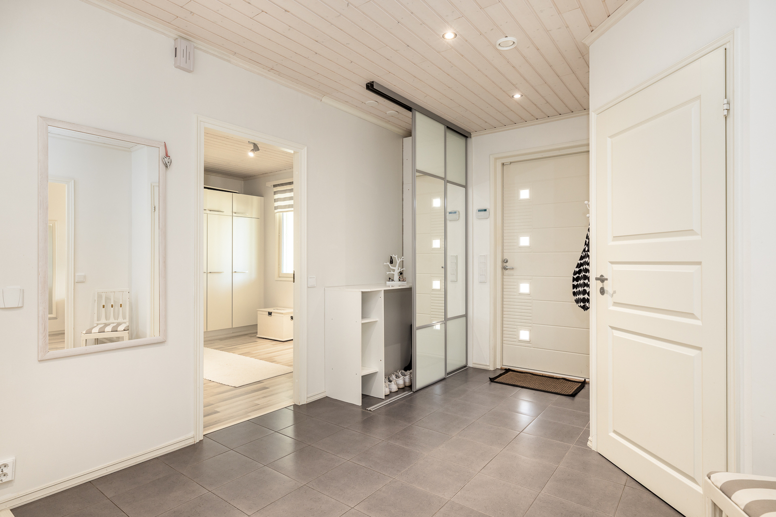 Talo on rakennettu yhteen tasoon ja tarjoaa toimivaa ja avaraa asumista koko perheelle. Neljä makuuhuonetta antavat hyvin tilaa niin arkeen kuin etätyöskentelyynkin. Tilava keittiö on osittain erillään olohuoneesta, mikä luo mukavan tasapainon avoimen tilaratkaisun ja erillisten oleskelutilojen välillä.