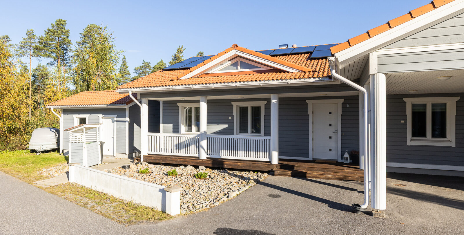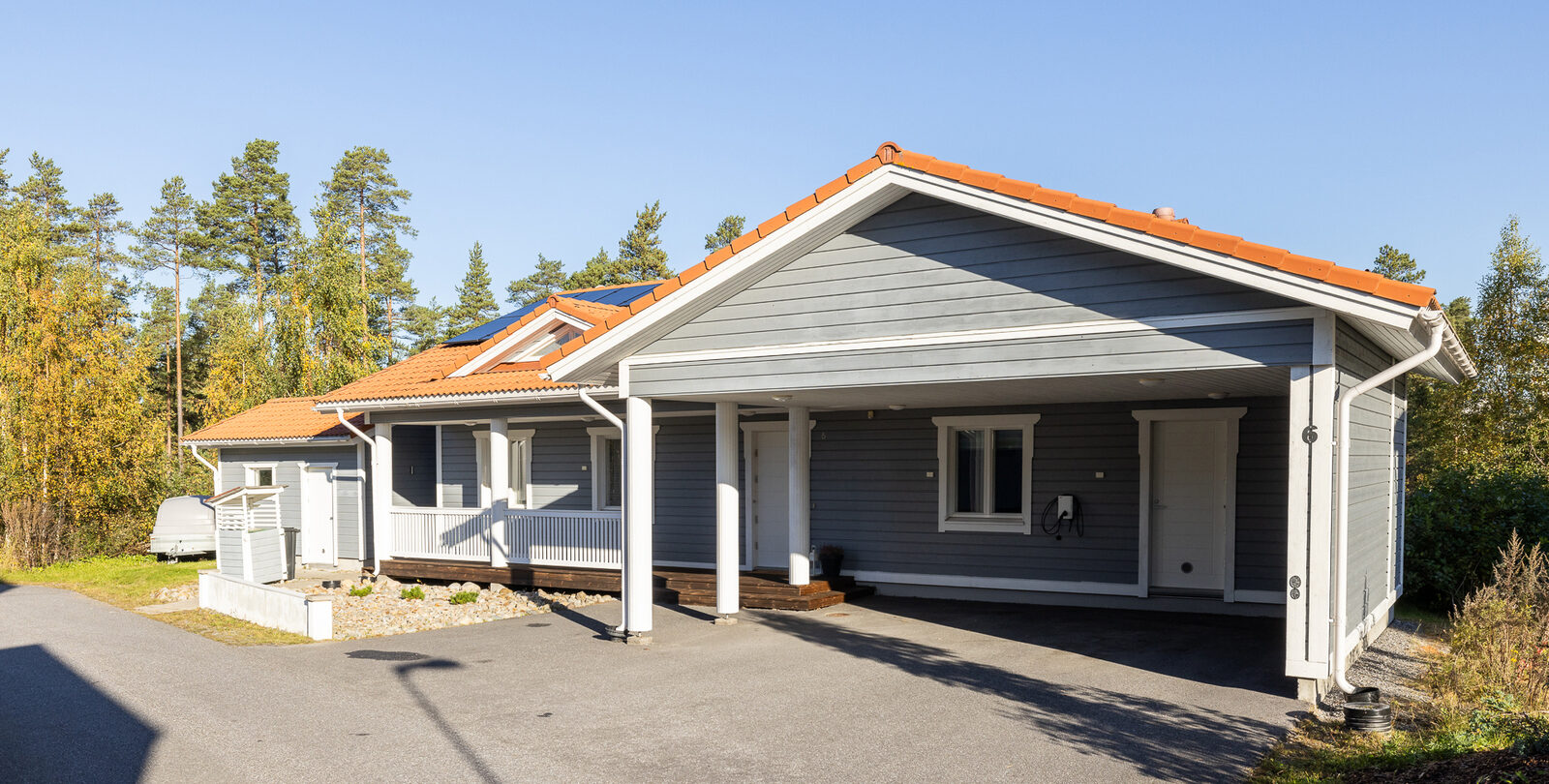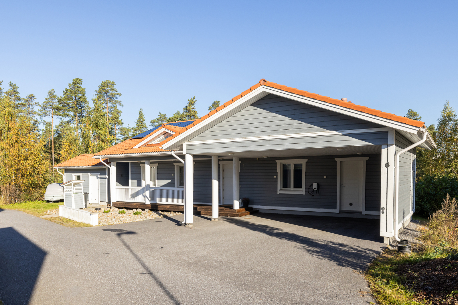 Taloon kuuluu käytännöllinen kahden auton katos, josta toisessa on sähköauton latausasema. Vieressä sijaitsee myös tekninen tila.