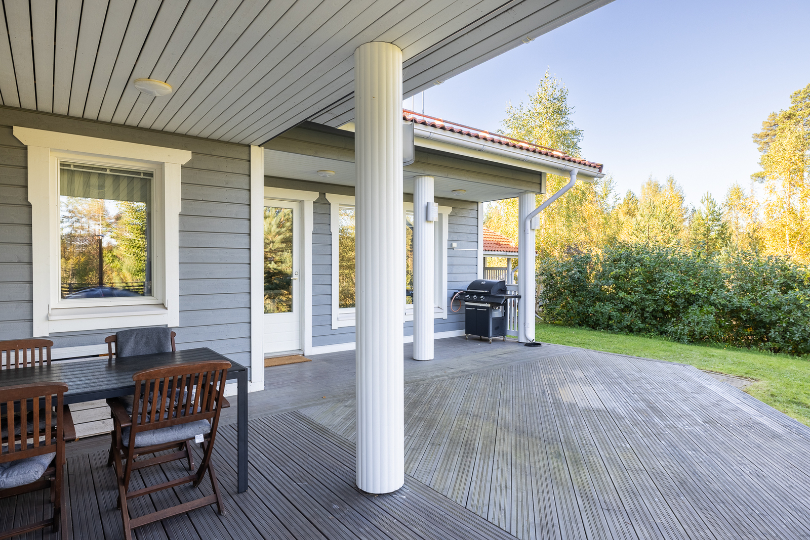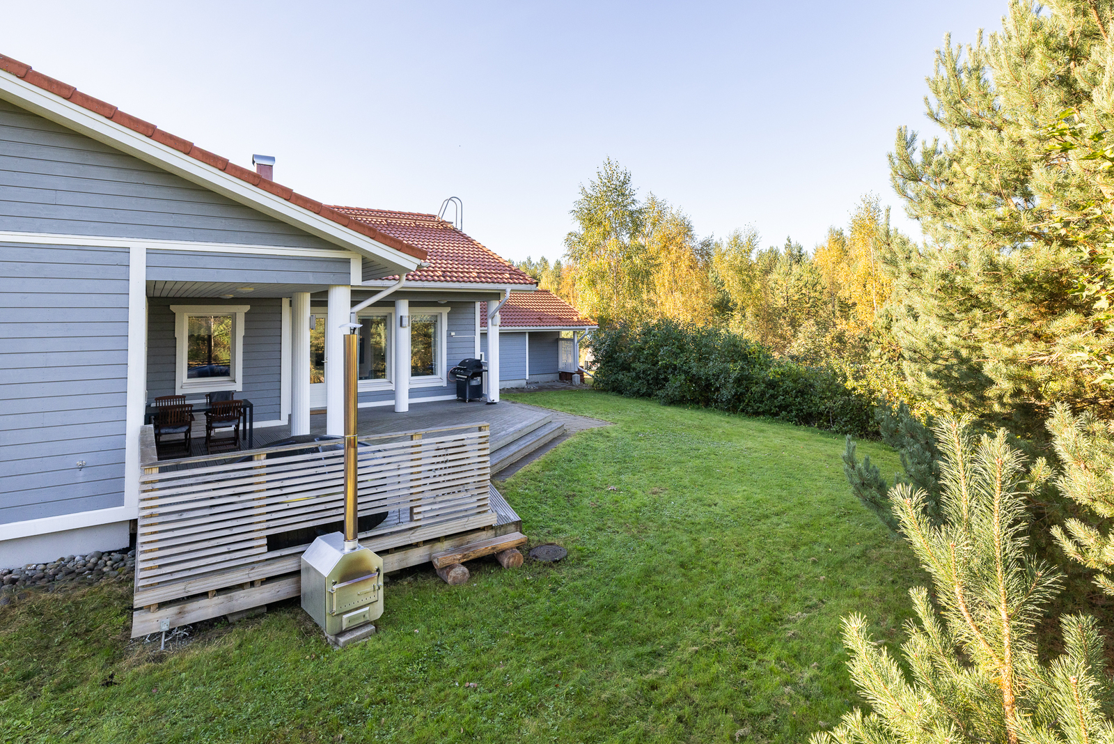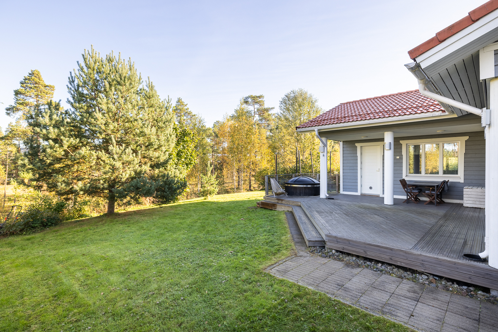 Suojaisalla sisäpihalla voit nauttia rauhasta ja rentoutua terassiin upotetussa paljussa. Tontilla on myös suuri lämmin varasto sekä lisäsäilytystilaa katoksen alla, sopii hyvin esimerkiksi polttopuiden säilytykseen.