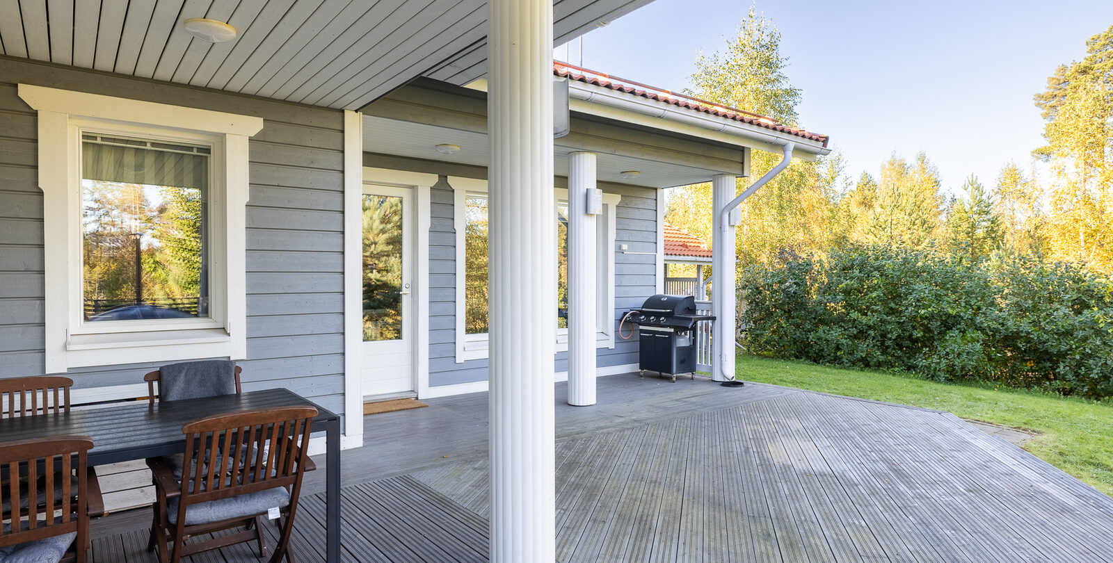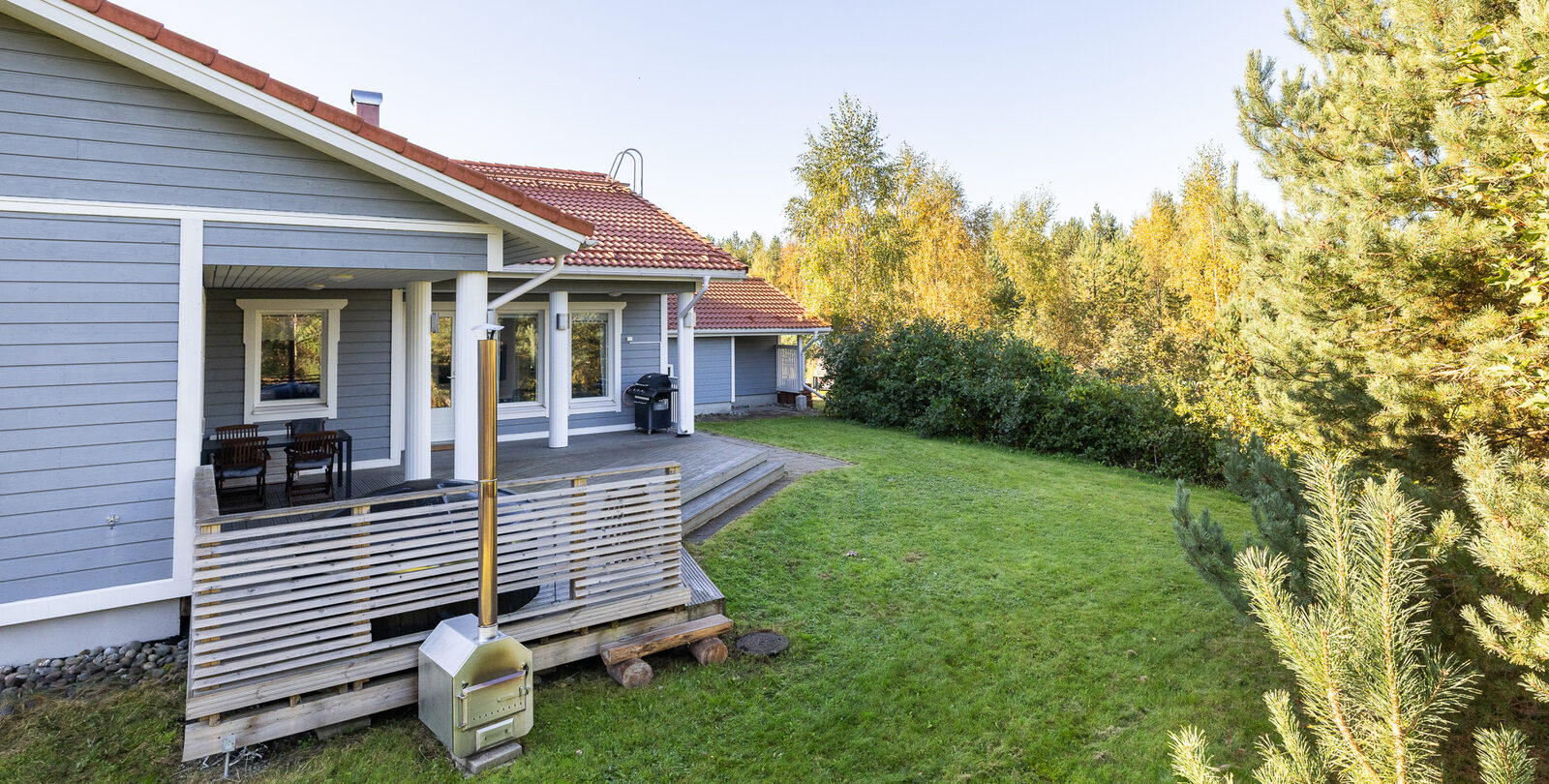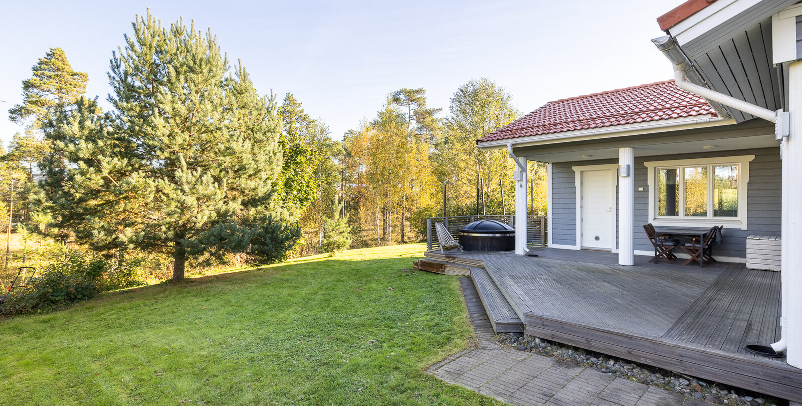 Suojaisalla sisäpihalla voit nauttia rauhasta ja rentoutua terassiin upotetussa paljussa. Tontilla on myös suuri lämmin varasto sekä lisäsäilytystilaa katoksen alla, sopii hyvin esimerkiksi polttopuiden säilytykseen.