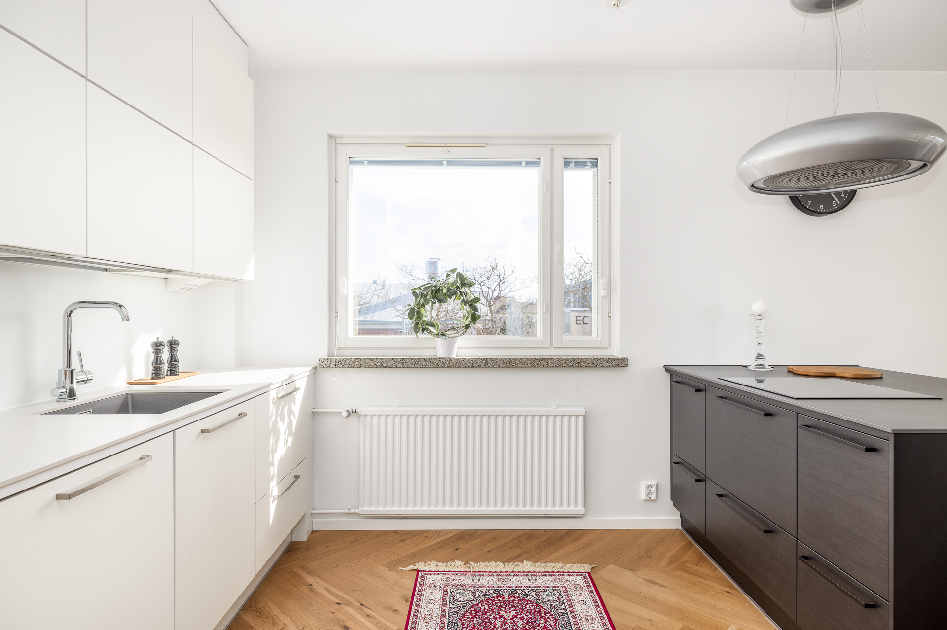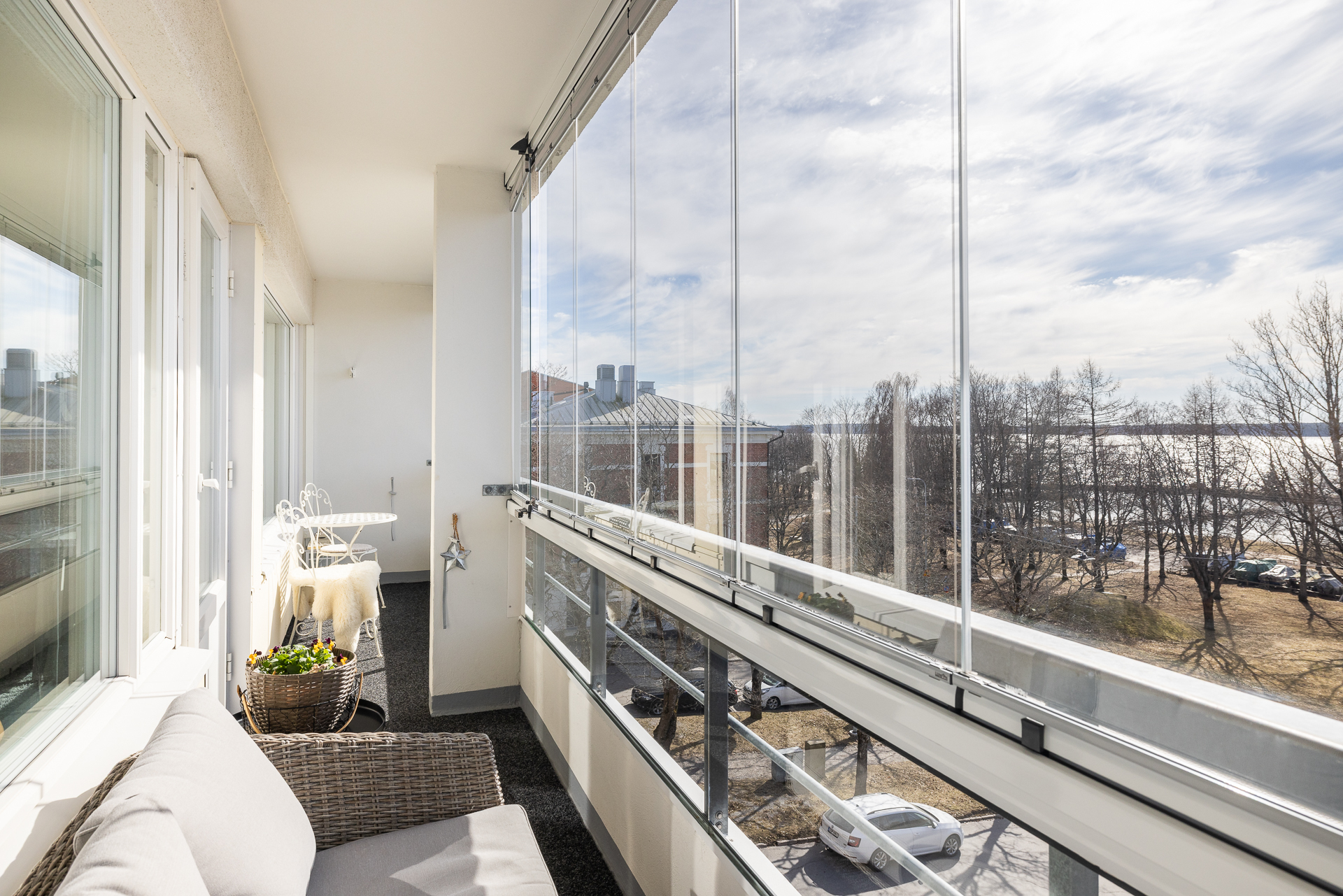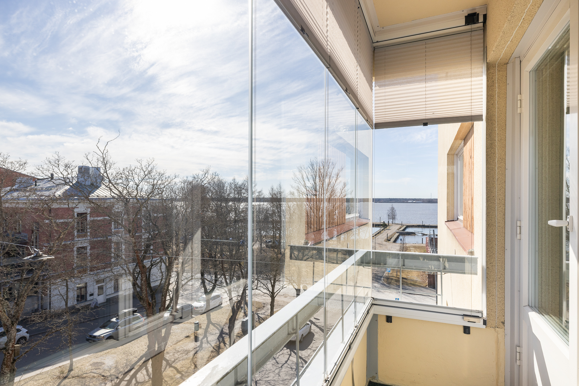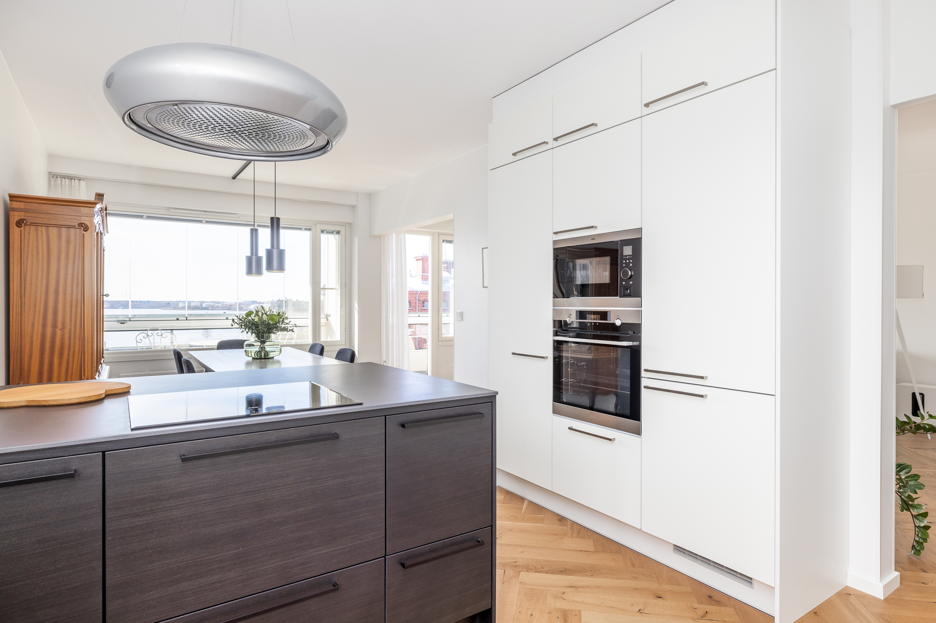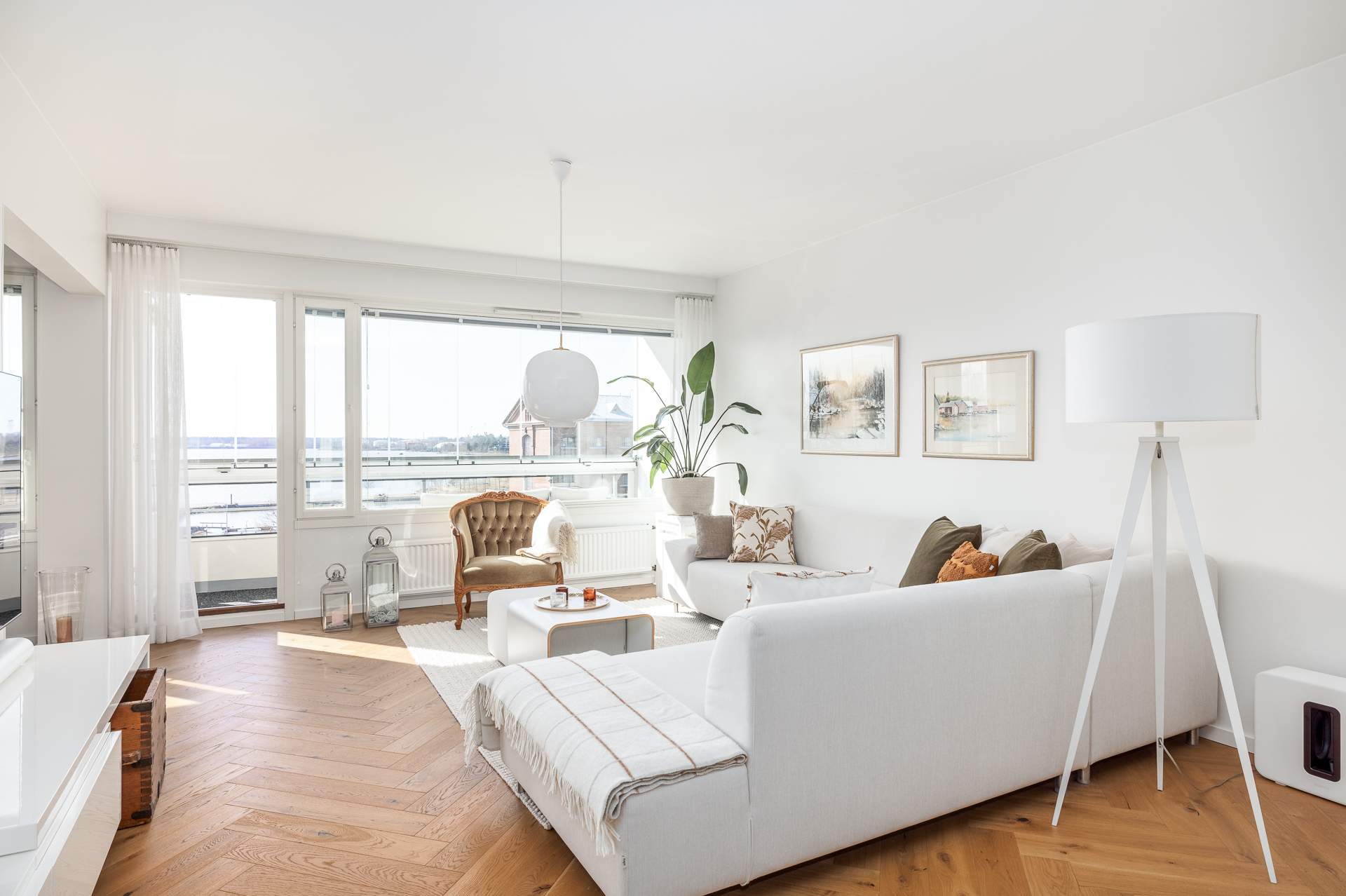 Lägenheten har total renoverats 2019 på ett mycket stiligt sätt och med kvalitativa material genomgående. Puustelli kök med köksö och öppna ytor förenar matplatsen med det rymliga vardagsrummet och med utgång till den långa inglasade balkongen mot väster. Två sovrum till den lugna innergårdssidan varav det större sovrummet har en egen inglasad balkong mot söder. Stiligt badrum och även en separat wc finns.