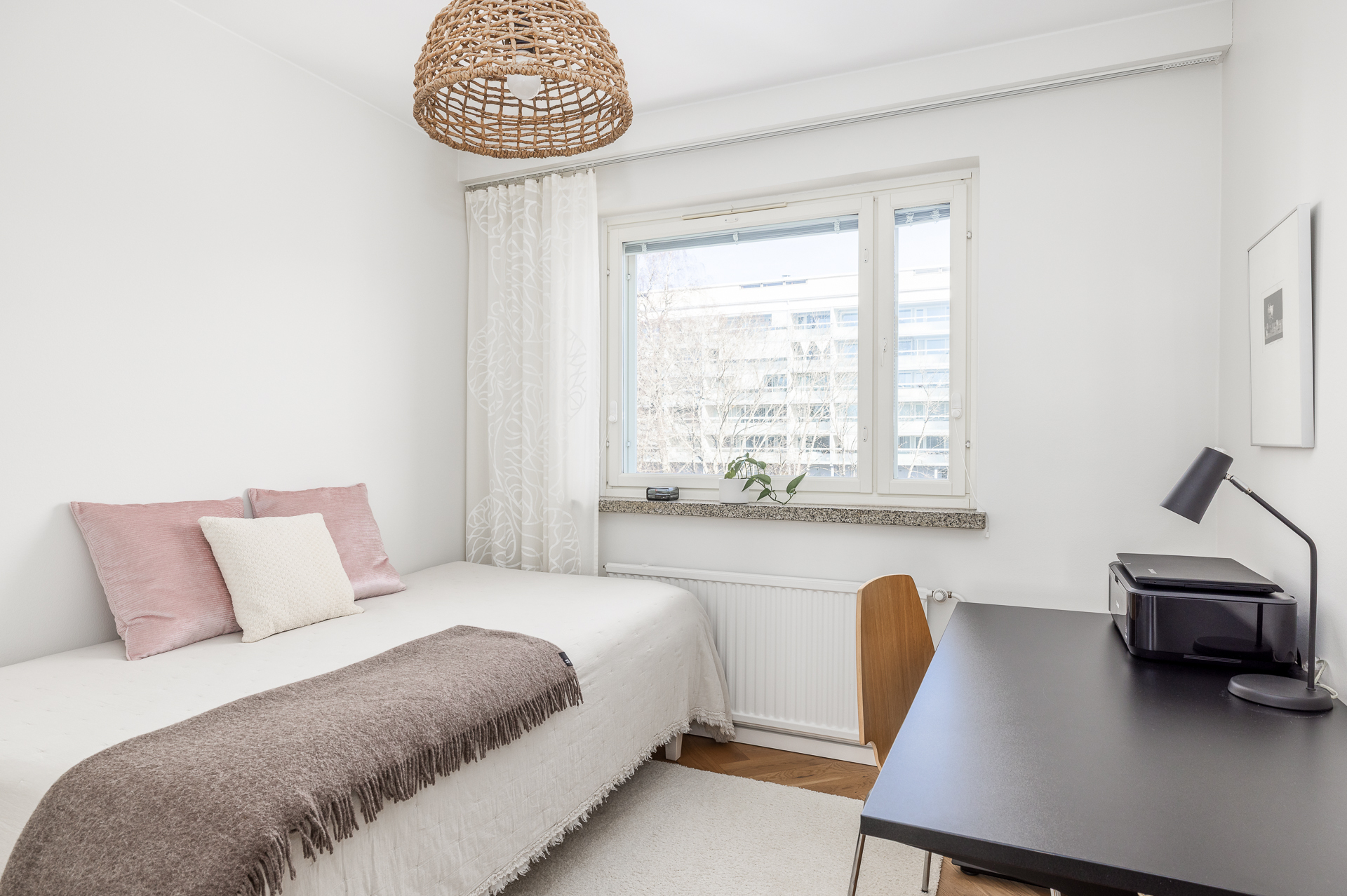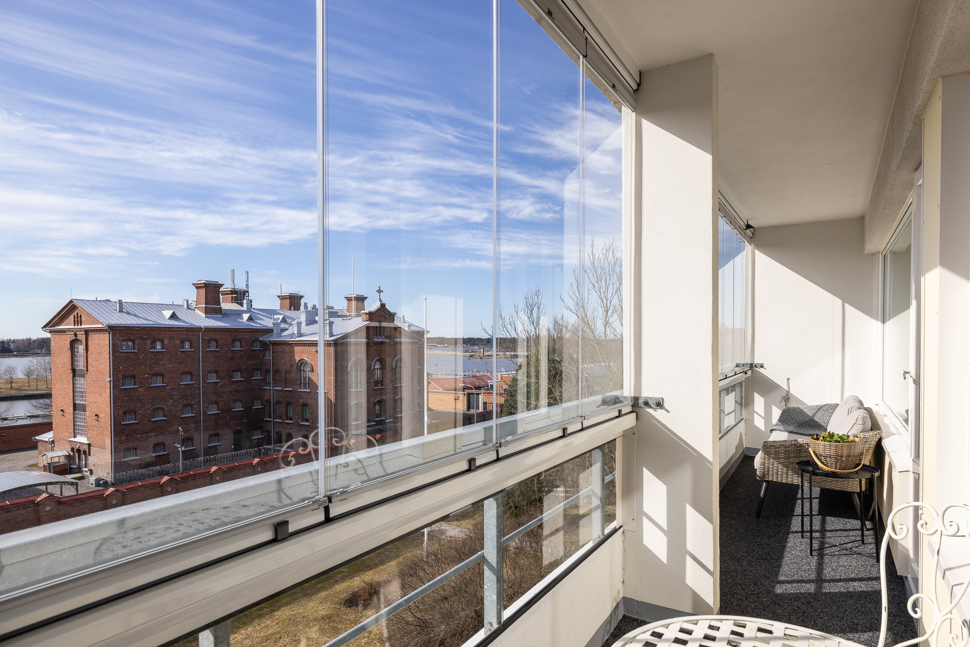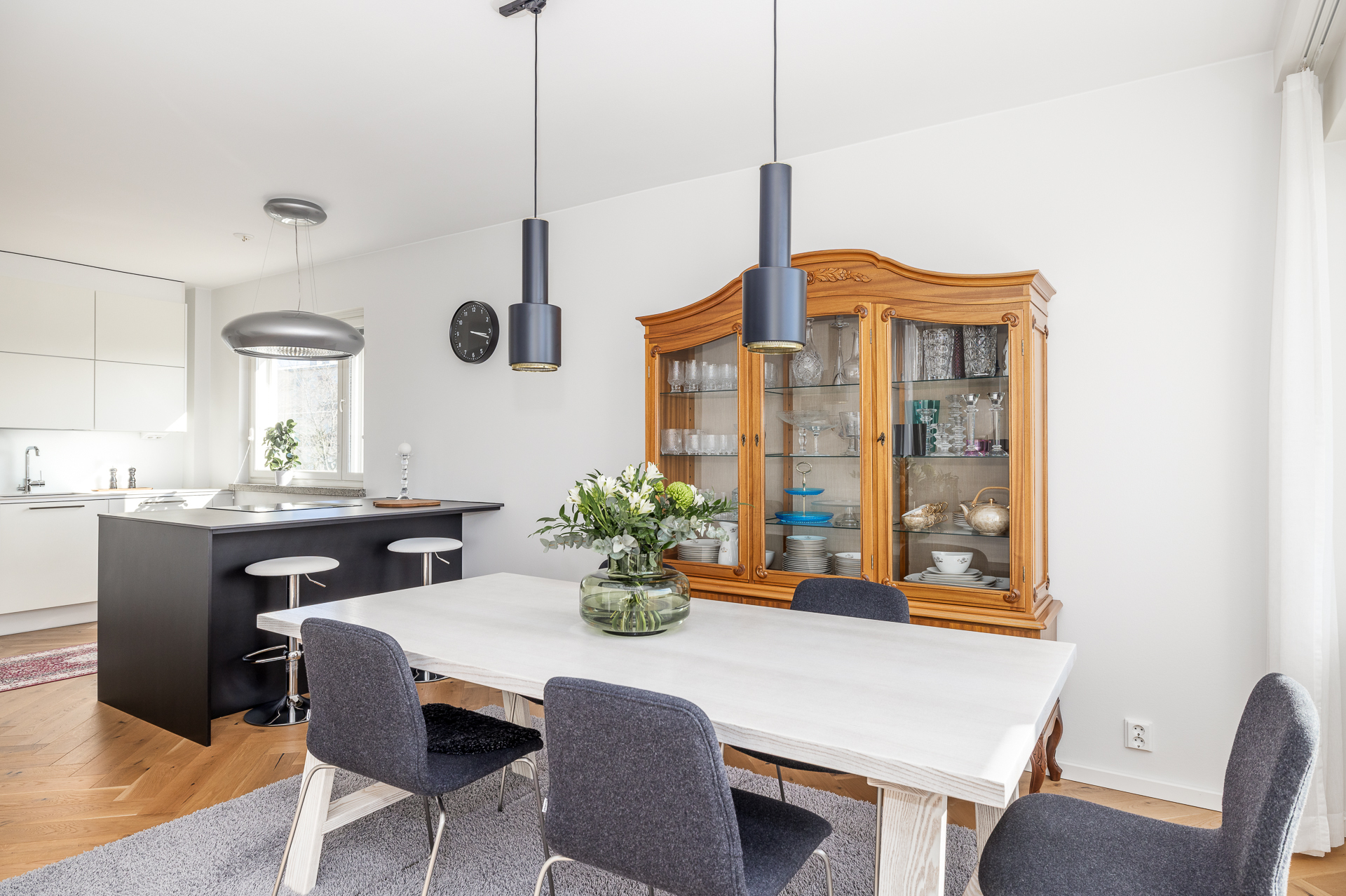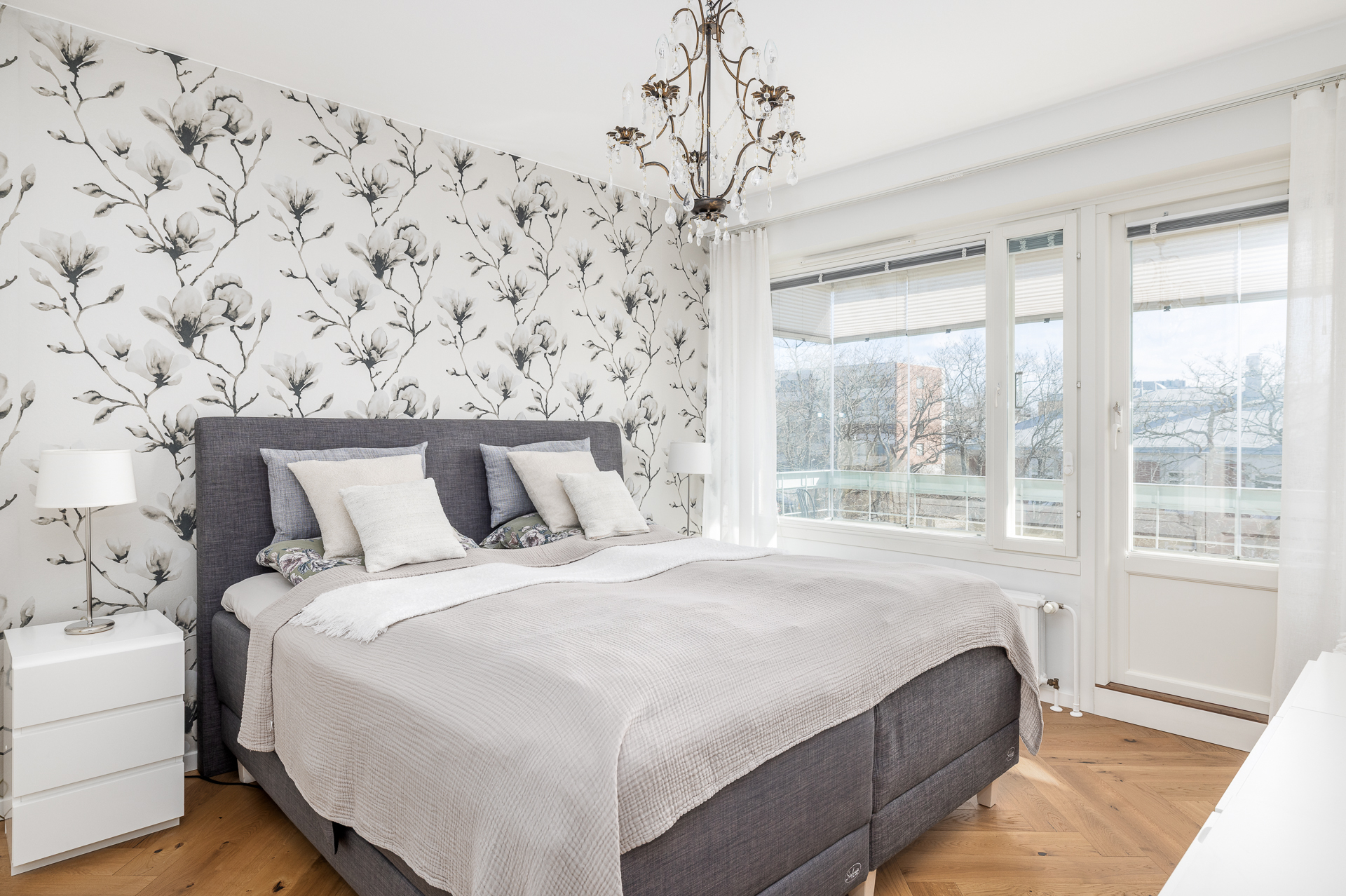 Lägenheten har total renoverats 2019 på ett mycket stiligt sätt och med kvalitativa material genomgående. Puustelli kök med köksö och öppna ytor förenar matplatsen med det rymliga vardagsrummet och med utgång till den långa inglasade balkongen mot väster. Två sovrum till den lugna innergårdssidan varav det större sovrummet har en egen inglasad balkong mot söder. Stiligt badrum och även en separat wc finns.