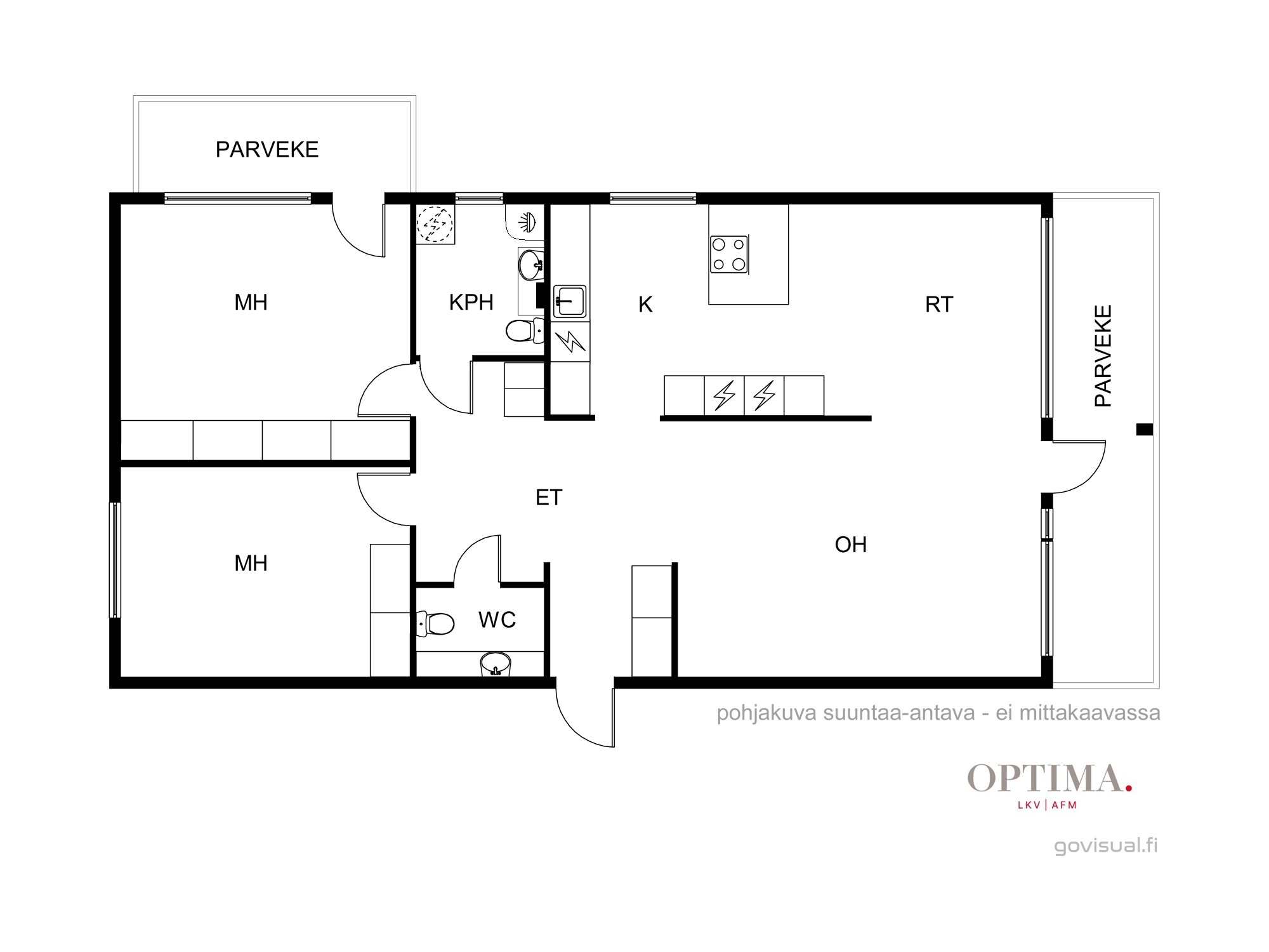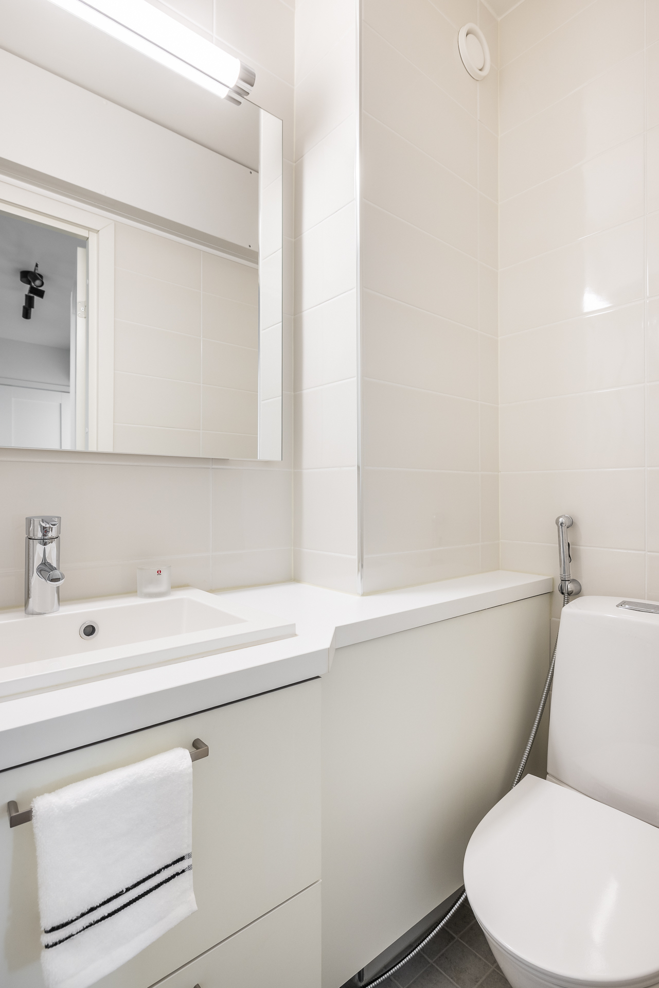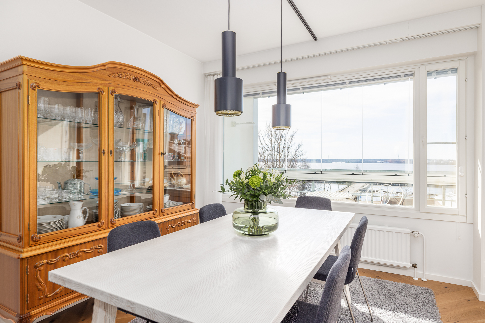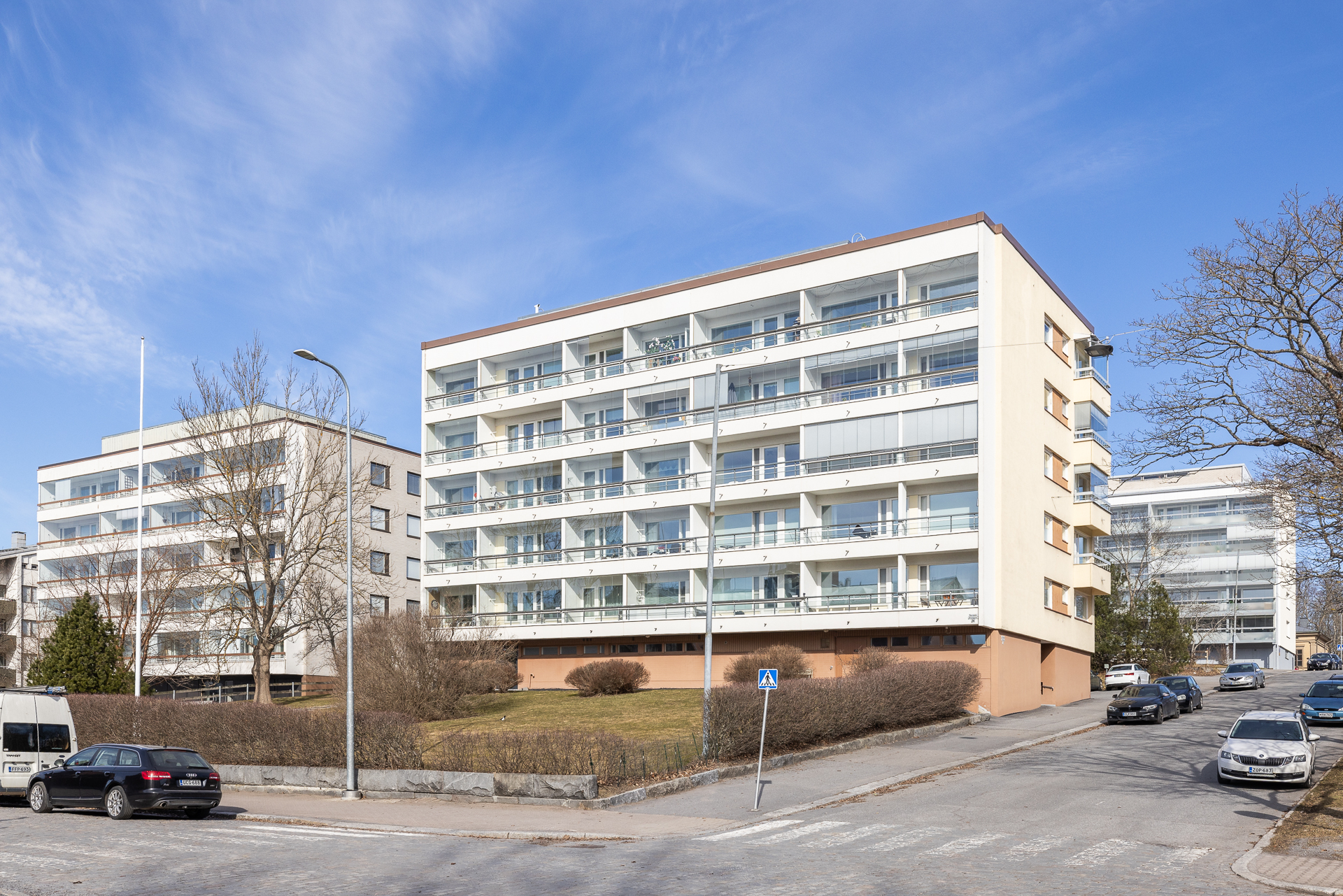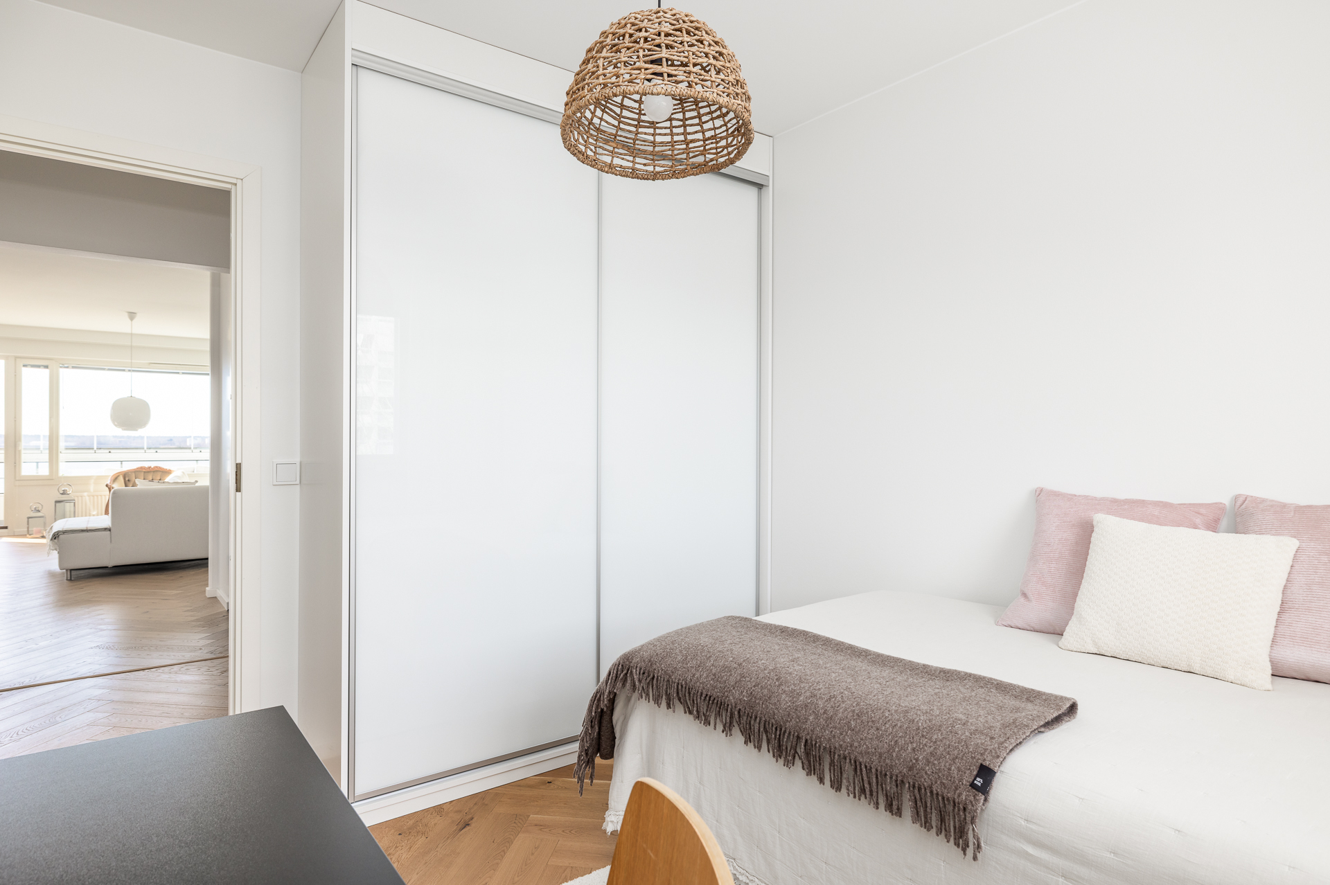 Lägenheten har total renoverats 2019 på ett mycket stiligt sätt och med kvalitativa material genomgående. Puustelli kök med köksö och öppna ytor förenar matplatsen med det rymliga vardagsrummet och med utgång till den långa inglasade balkongen mot väster. Två sovrum till den lugna innergårdssidan varav det större sovrummet har en egen inglasad balkong mot söder. Stiligt badrum och även en separat wc finns.