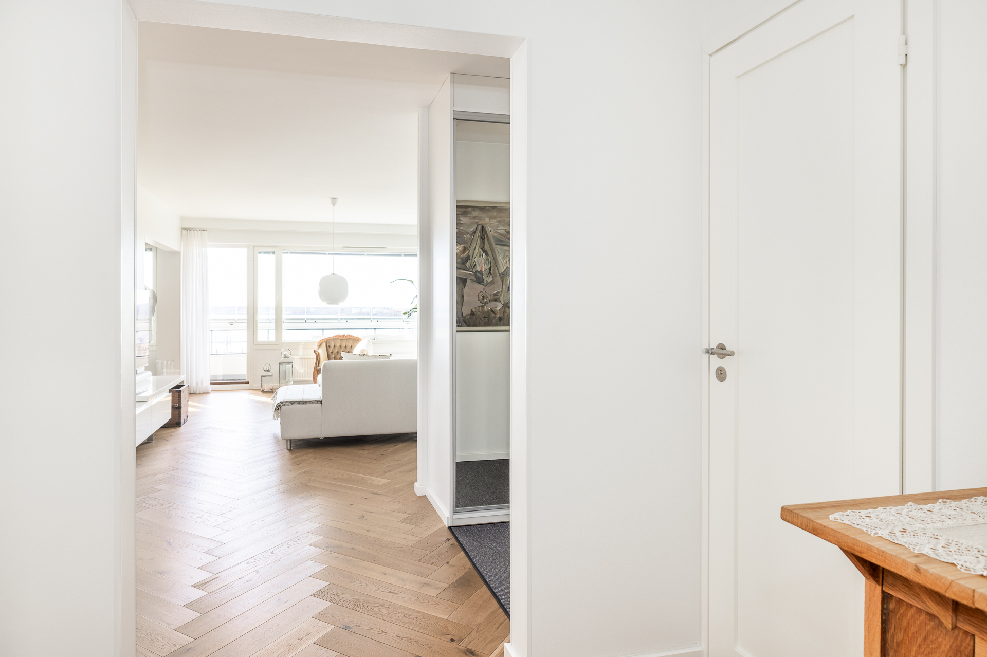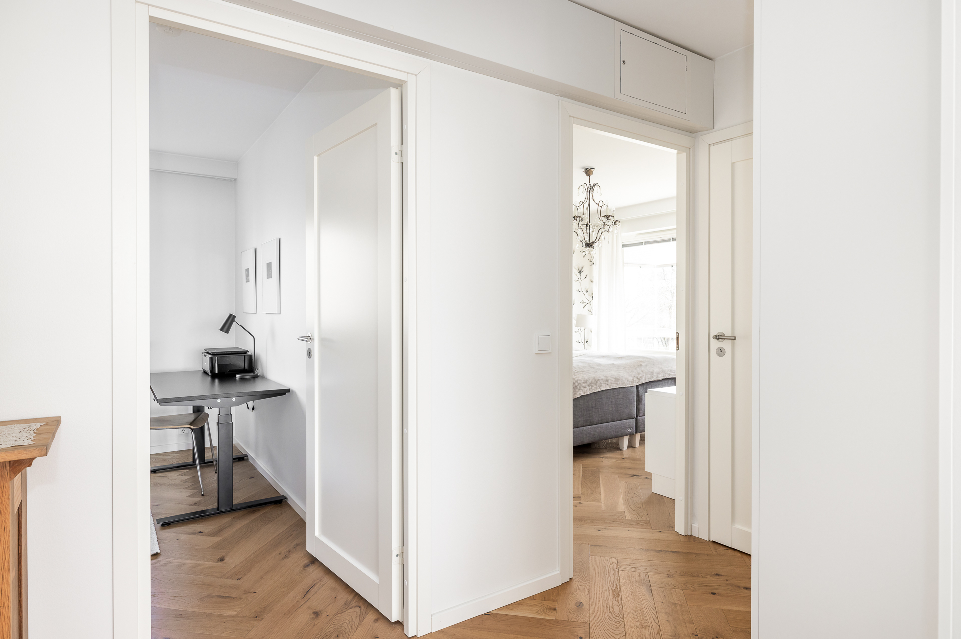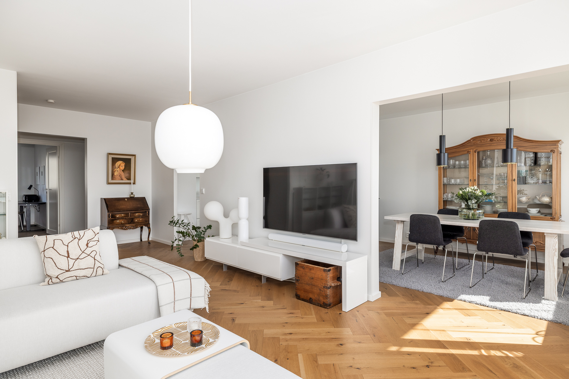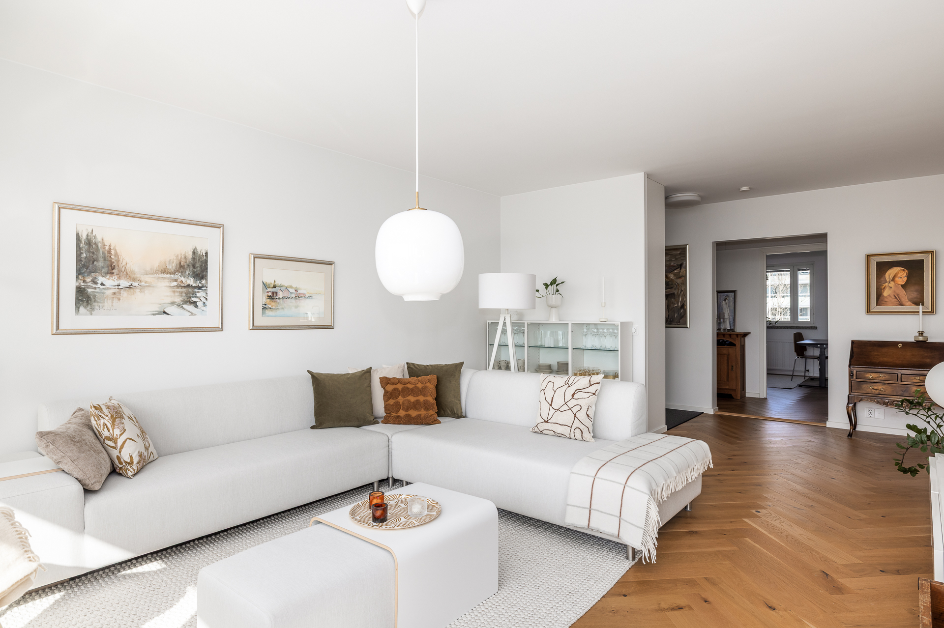 Ljusa ytor och stiligt enhetligt fiskbensparkettgolv i hela lägenheten.