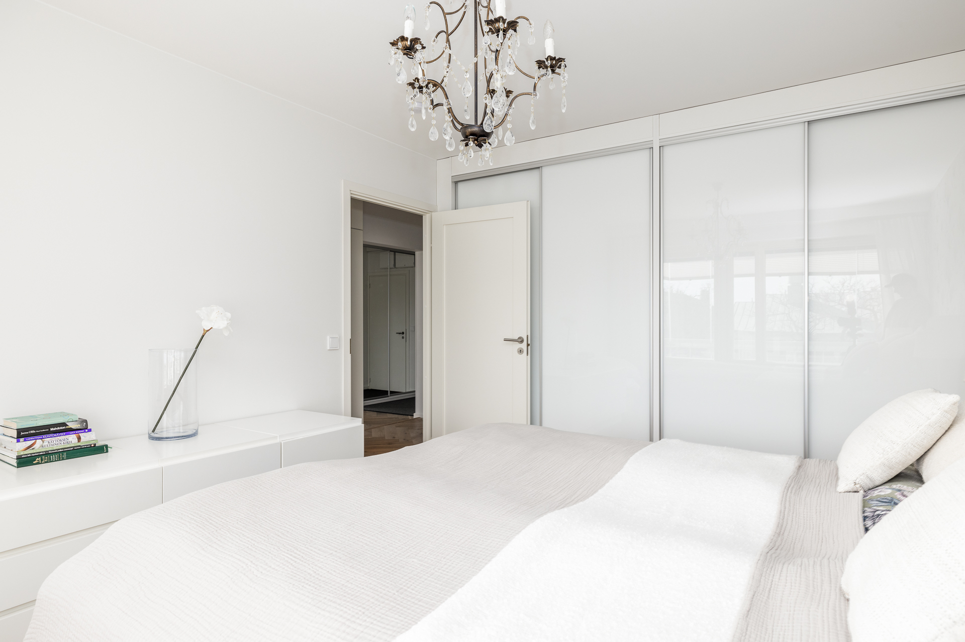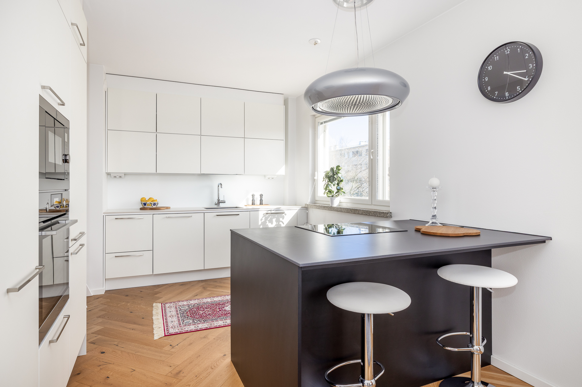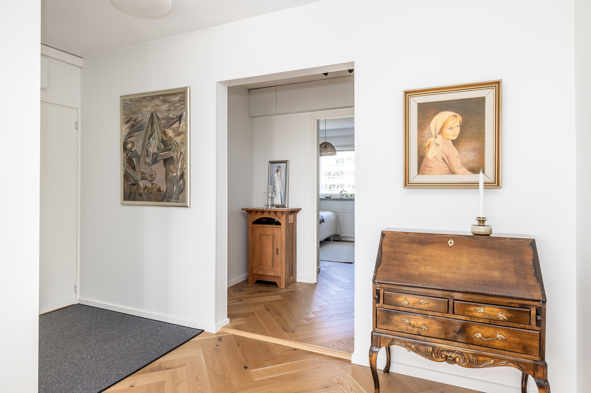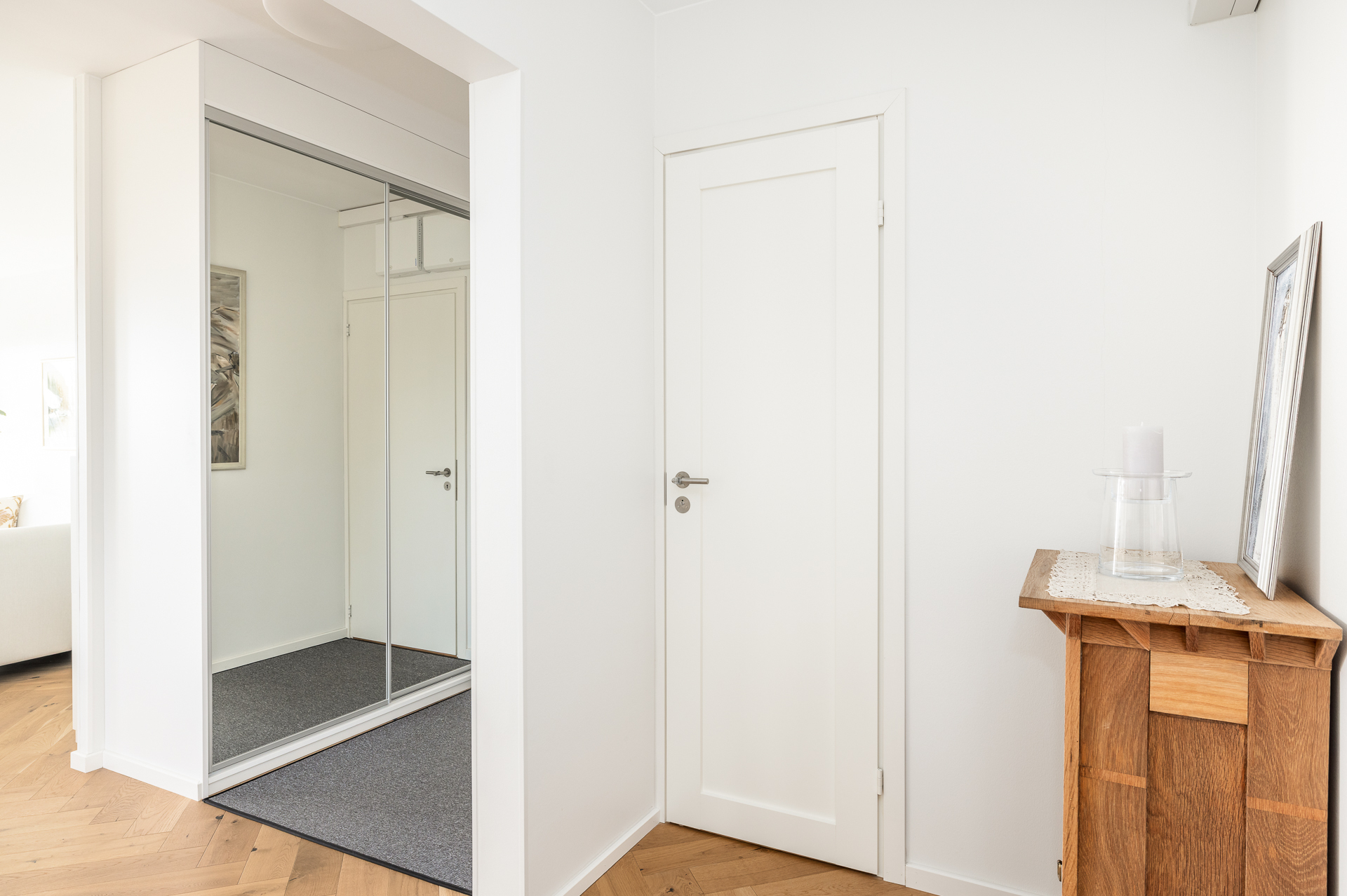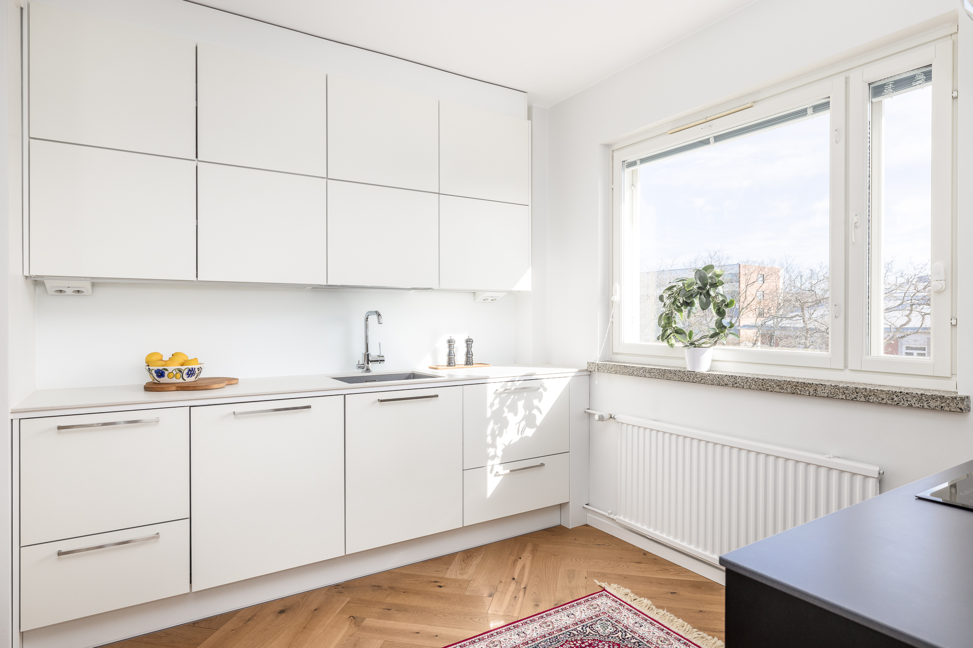 Ljusa ytor och stiligt enhetligt fiskbensparkettgolv i hela lägenheten.