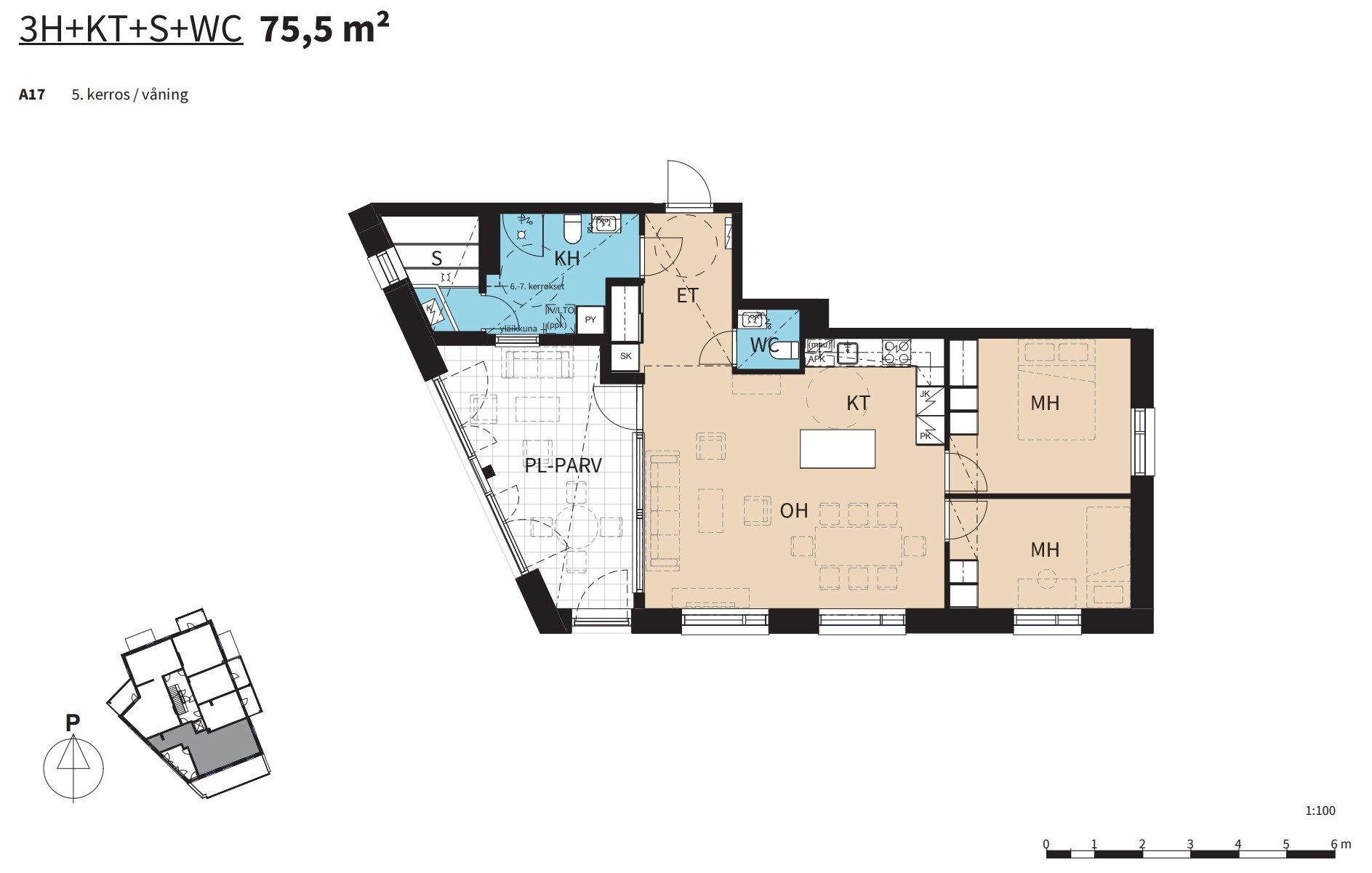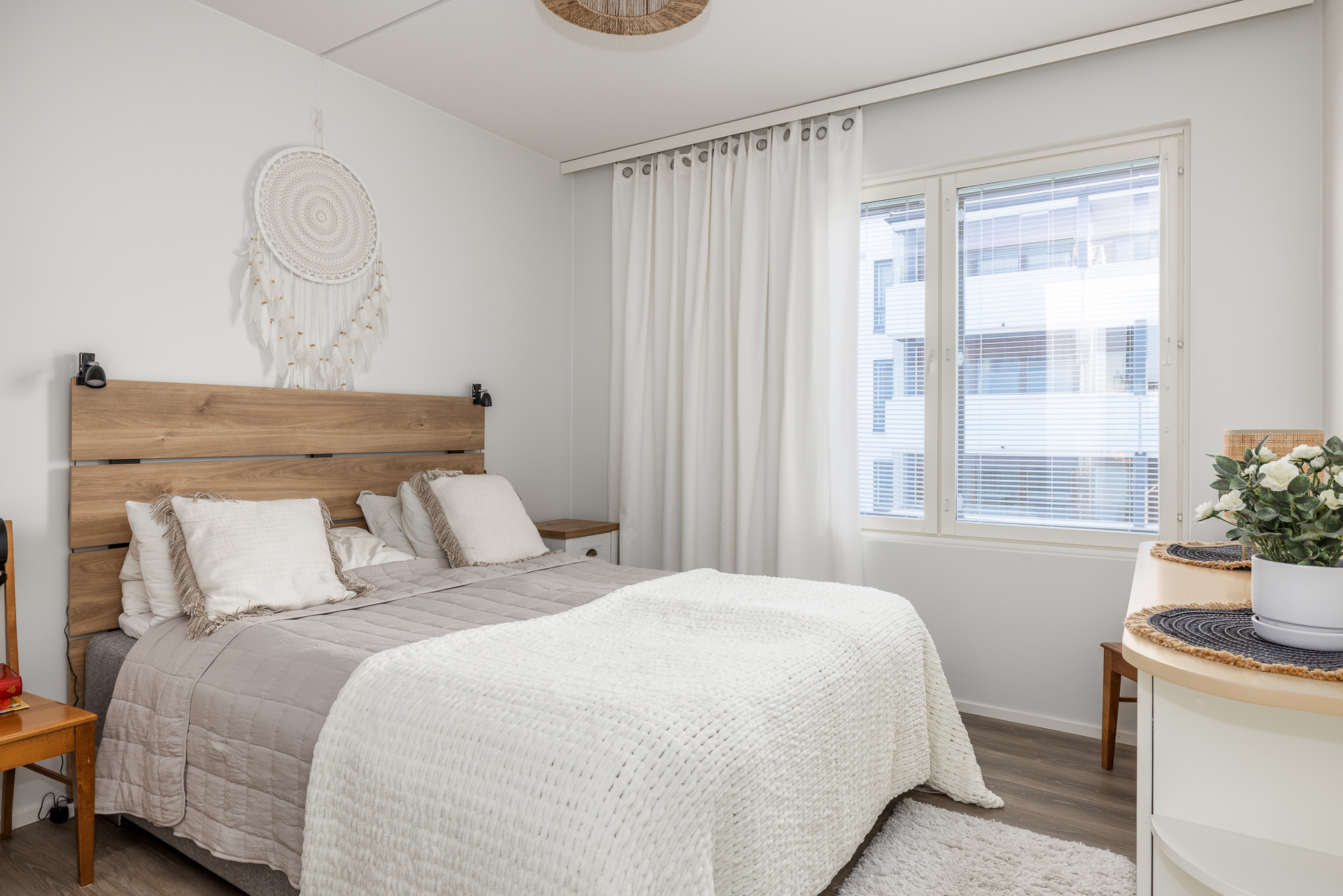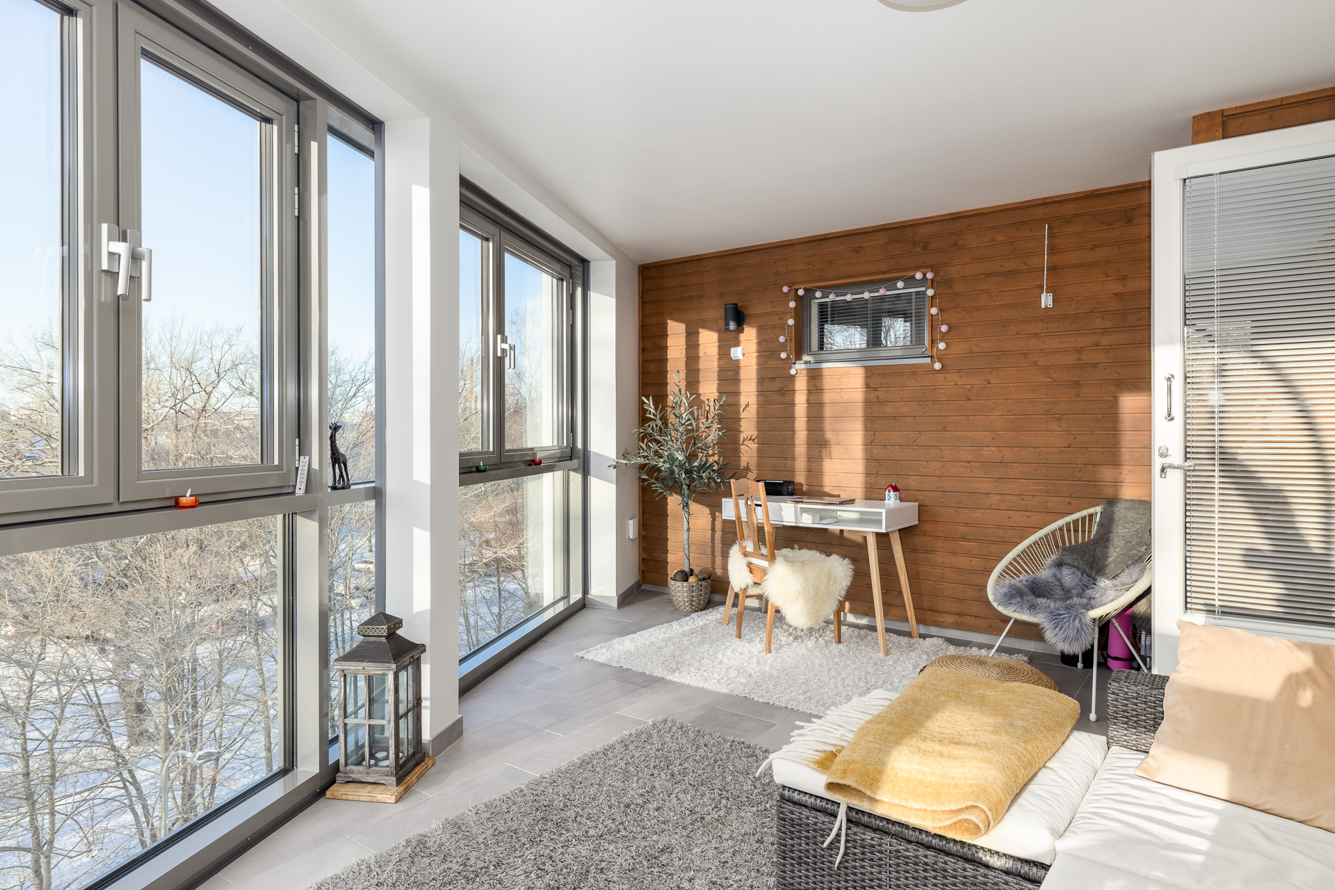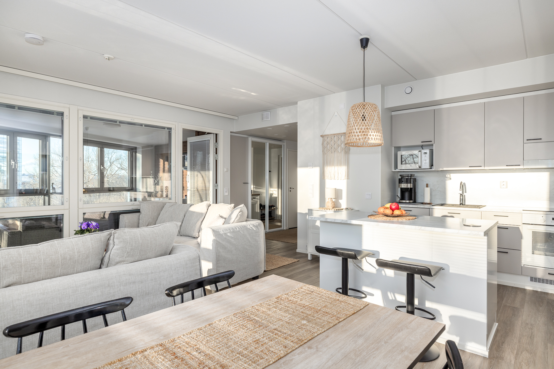 Lägenheten som är 75,5m² har dessutom en verkligt rymlig halvvarm balkong med golvvärme och som kan användas som ett extra rum större delen av året.