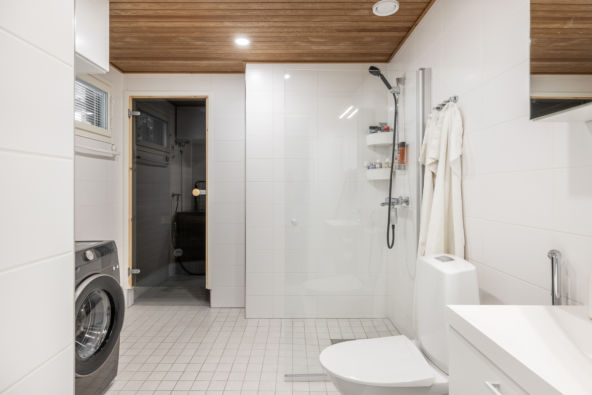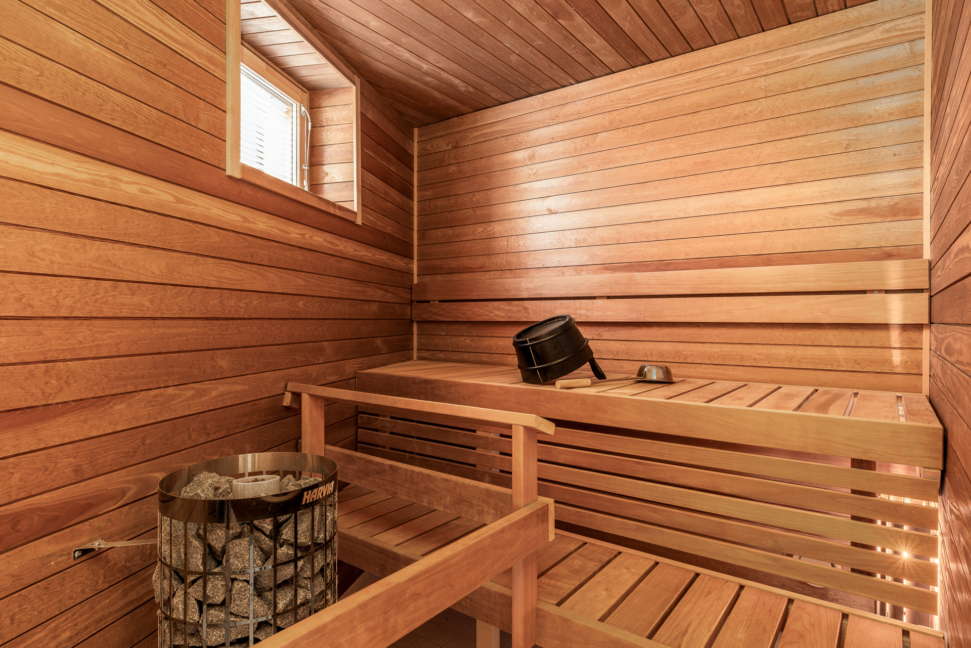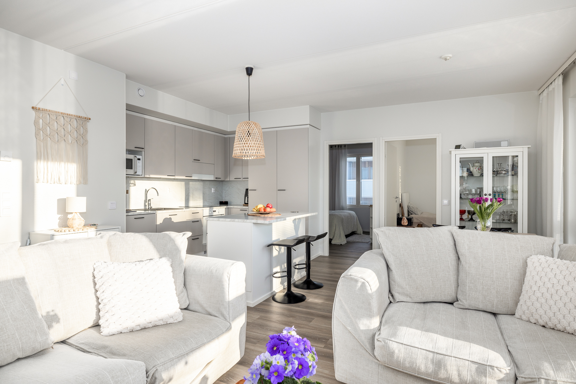 Lägenheten har öppna ytor i kök och vardagsrum, två sovrum, stort badrum och egen fin bastu samt en separat wc.