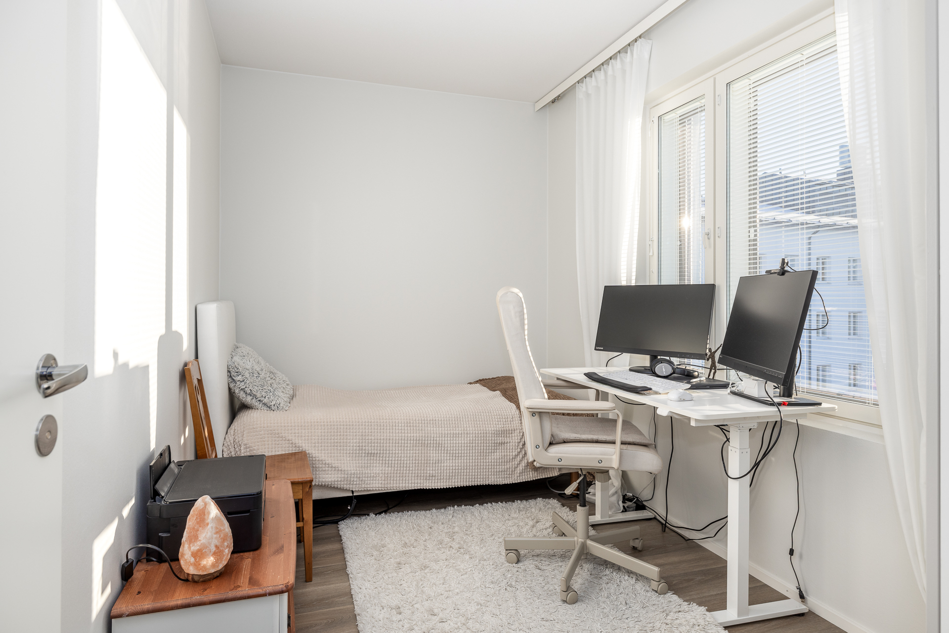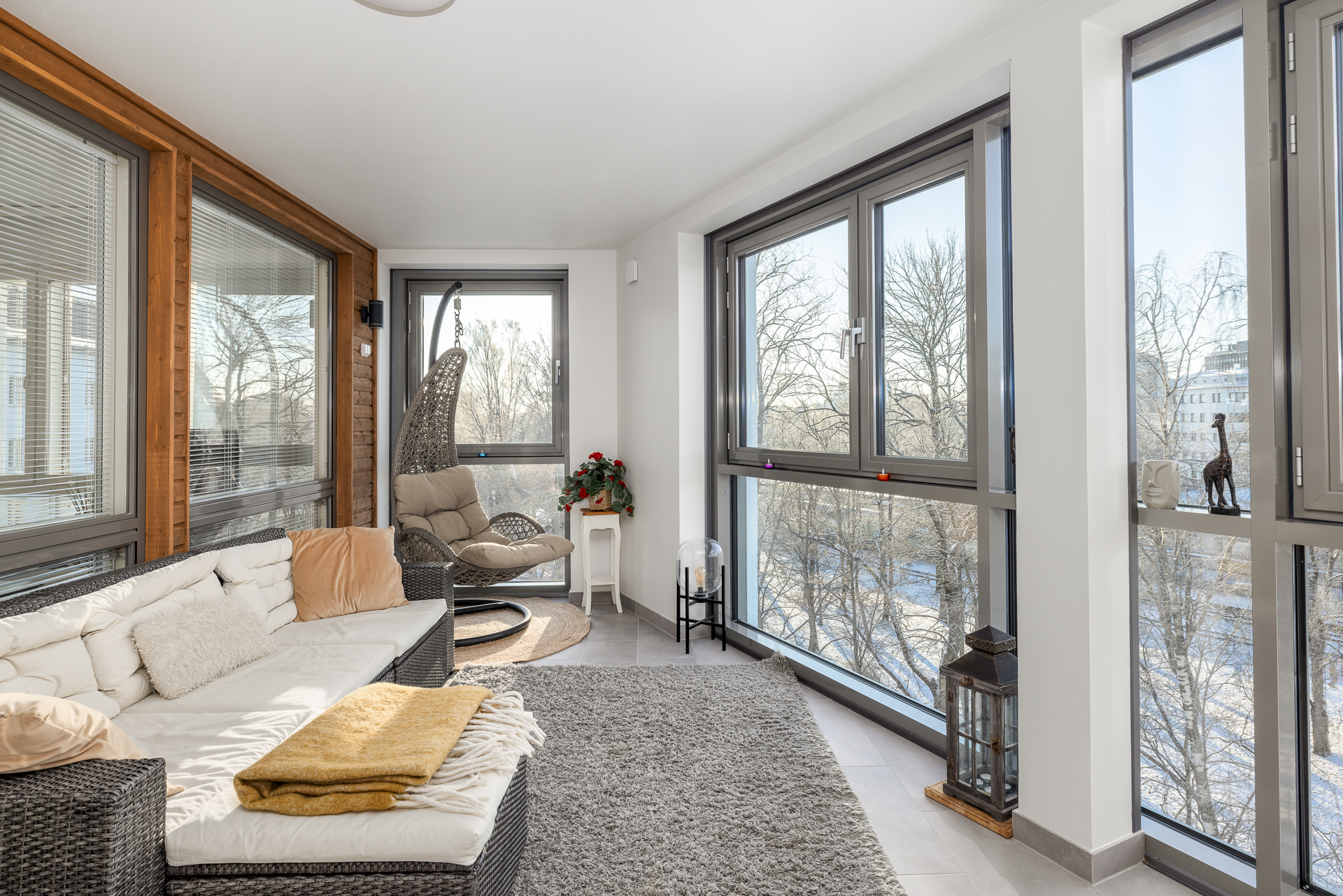 Från lägenheten har man utsikter i tre riktningar och mycket ljusinsläpp tack vare de stora fönstren med härliga utsikter in mot centrum och stationsparken, som sommartid är en grön oas alldeles på andra sidan gatan.