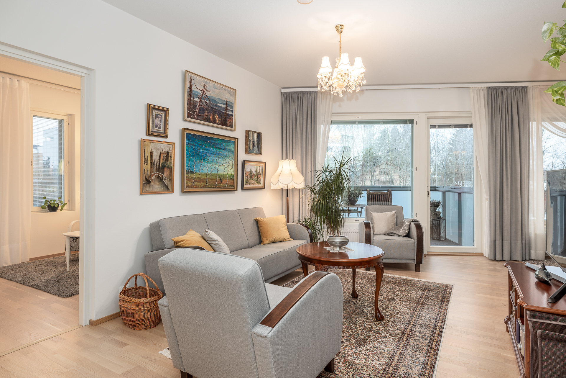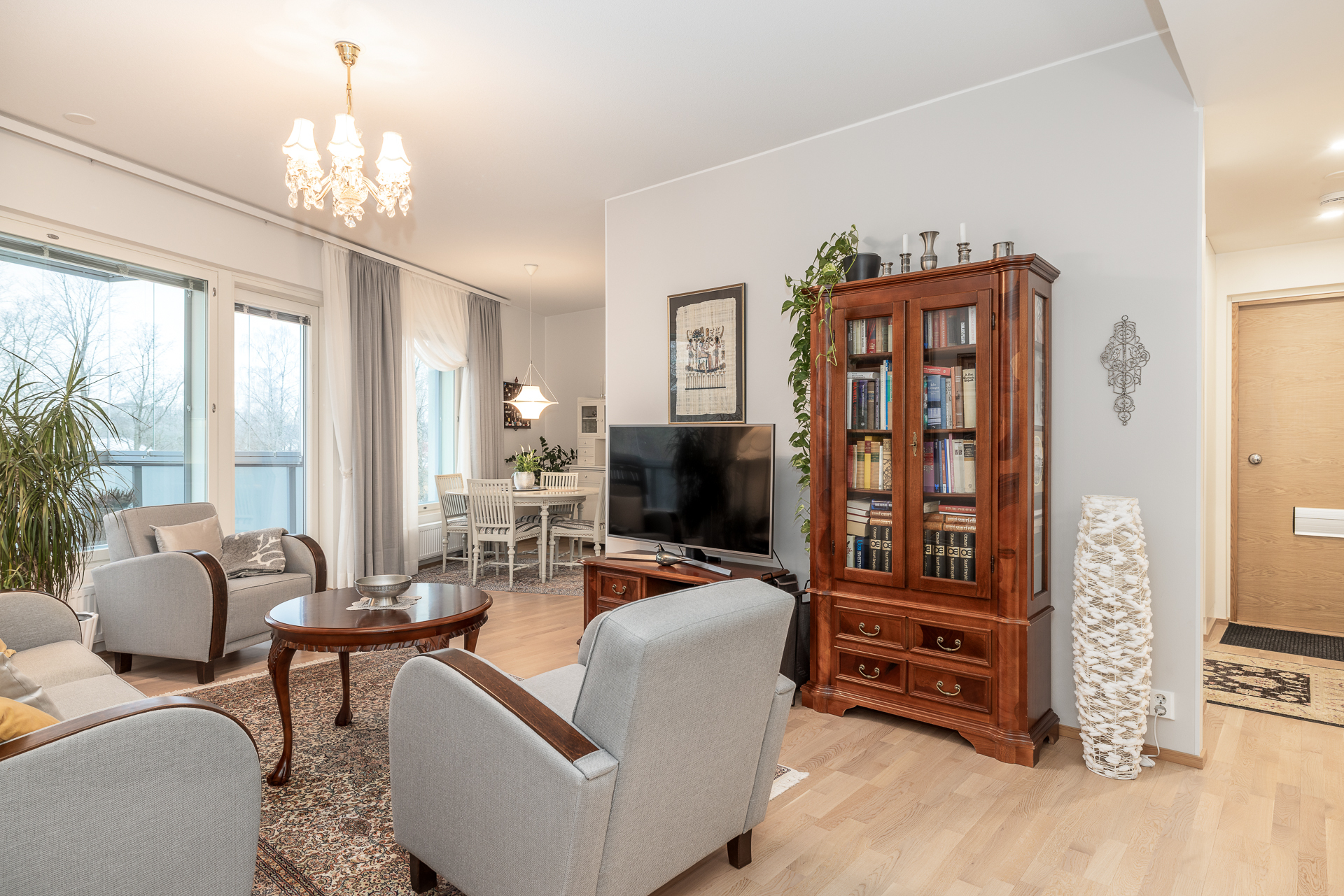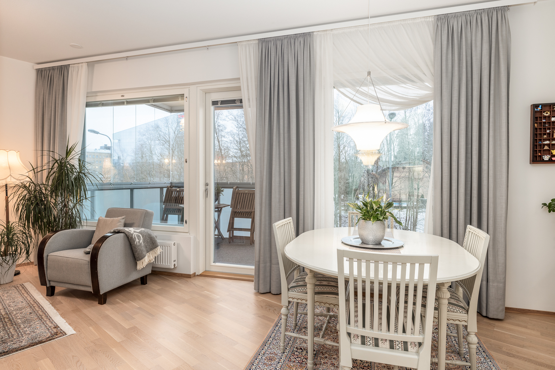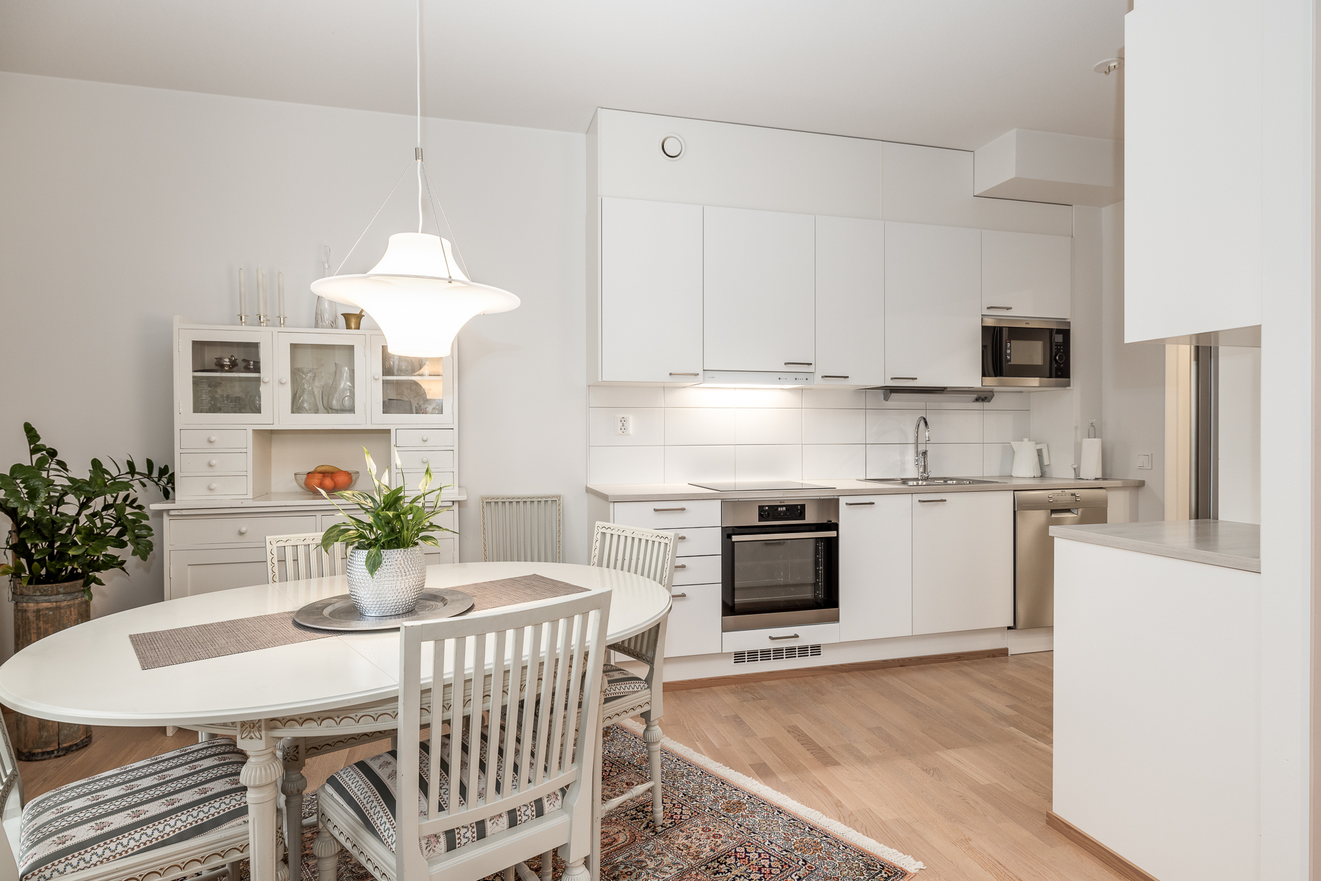 Väldigt ljus, hemtrevlig och välhållen lägenhet med två sovrum, vardagsrum, kök, stort badrum och egen bastu samt en inglasad balkong mot sydväst med fria utsikter. Gott om förvaringsutrymme och i det ena sovrummet finns även ett praktiskt klädrum.