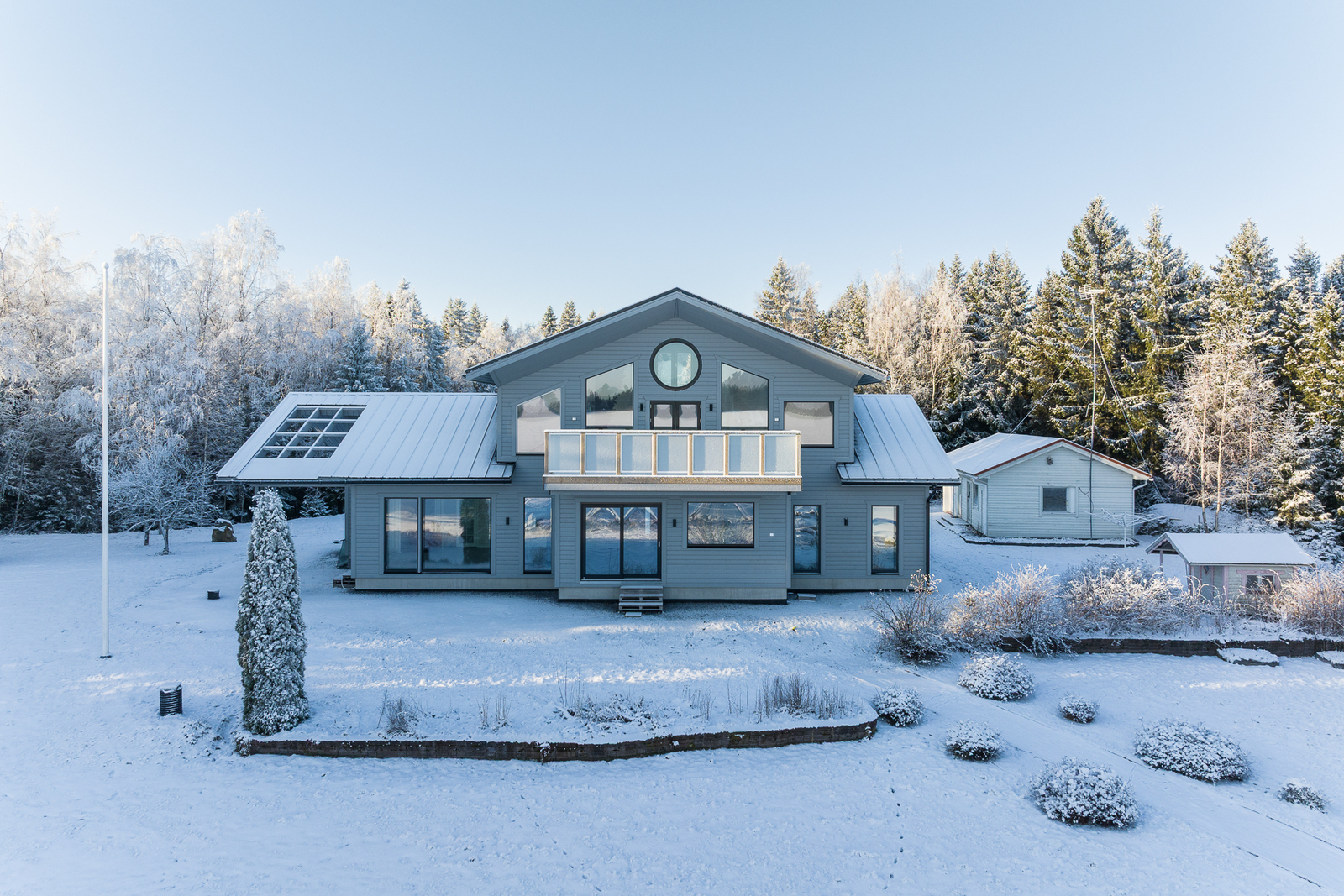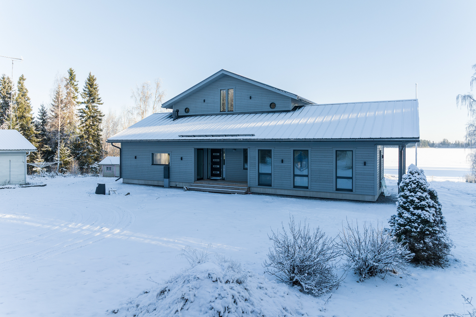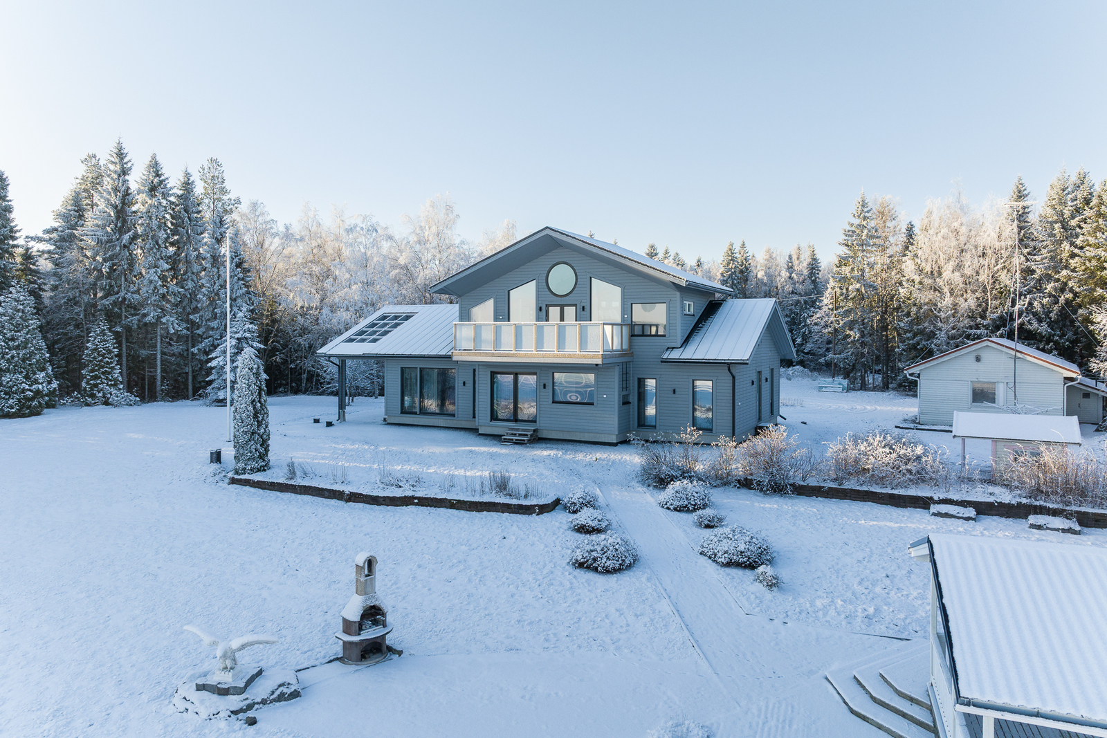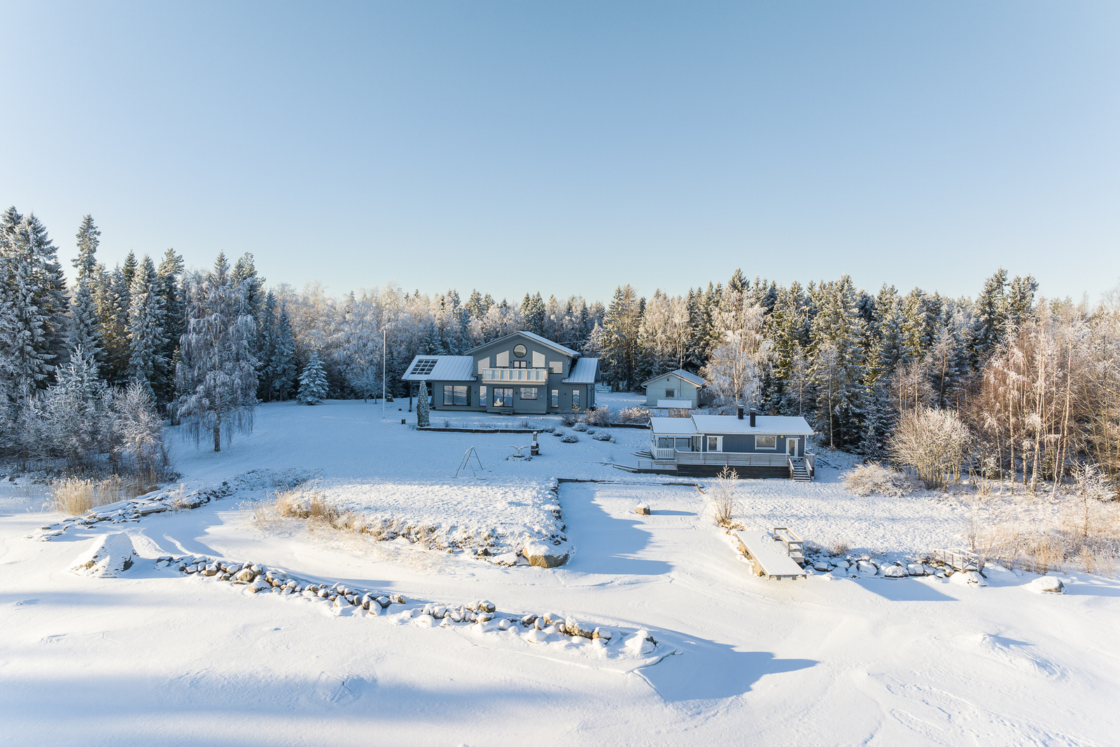 Fin helhet med ett stort och ståtligt nytt egnahemshus, rymlig strandbastu byggnad, varm garagebyggnad med plats för två bilar, separat ekonomibyggnad med hobbyutrymme, förvaring, garage och biltak. Stor strandtomt med egen ca 100m lång strandlinje och egen sandstrand och muddrad strand.
